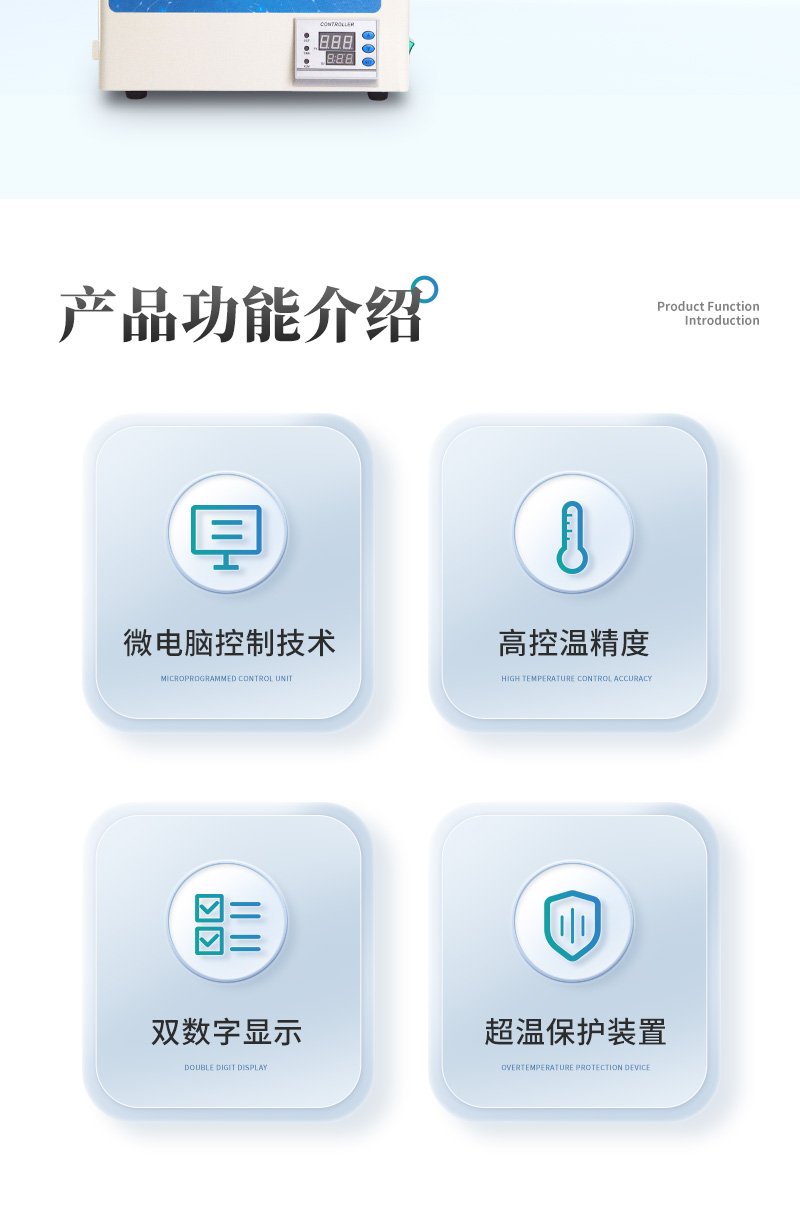 | 分配室上各氣針通道可組合使用或單獨使用,每一路氣針均可單獨開關。分配室的高度可視需要調節。 | 每一路氣體流量可單獨進行調節,克服了不可調氮吹儀各氣路氣流量大小不一的弱點。 | 數字溫控器,雙數字顯示. | 可能與溶劑接觸的部件均采用不銹鋼材料、合金鋁并表面進行塑料噴涂,使用壽命長且清潔方便。 | 整機可放入通風櫥中使用。 | 一般標配的加熱塊規格為孔徑∮16mm。 |