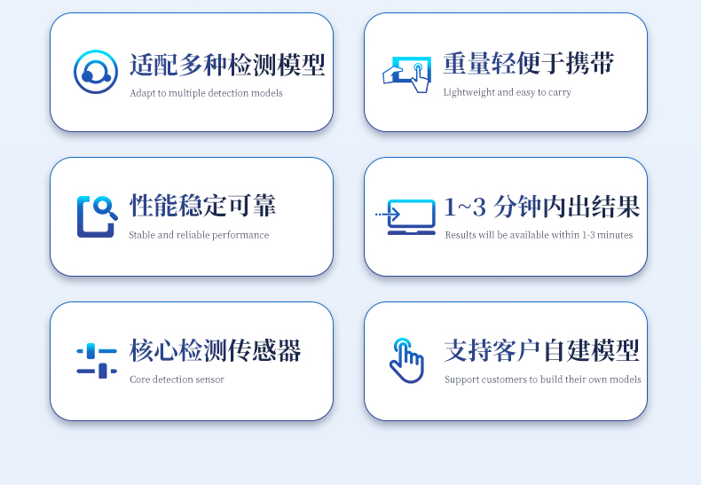 | ◆ 進口核心檢測傳感器,性能穩定可靠; | ◆ 快速無損檢測,1~3 分鐘內出結果; | ◆ 10 吋觸屏操作簡單,使用方便; | ◆ 適用性廣,可適配多種檢測模型; | ◆ 支持客戶自建模型; | ◆ 體積小、重量輕,便于攜帶; |