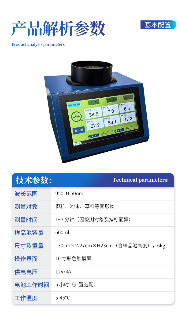 | 波長范圍:950-1650nm | 測量對象:顆粒、粉末、草料等固形物 | 測量時間:1~3 分鐘(因檢測對象及指標而異) | 樣品池容量:600ml | 尺寸及重量:L30cm×W27cm×H23cm(含樣品池高度),6kg | 操作界面:10 寸彩色觸摸屏 | 供電電壓:12V/4A | 電池工作時間:5 小時(外置選配) | 工作溫度:5-45℃ |