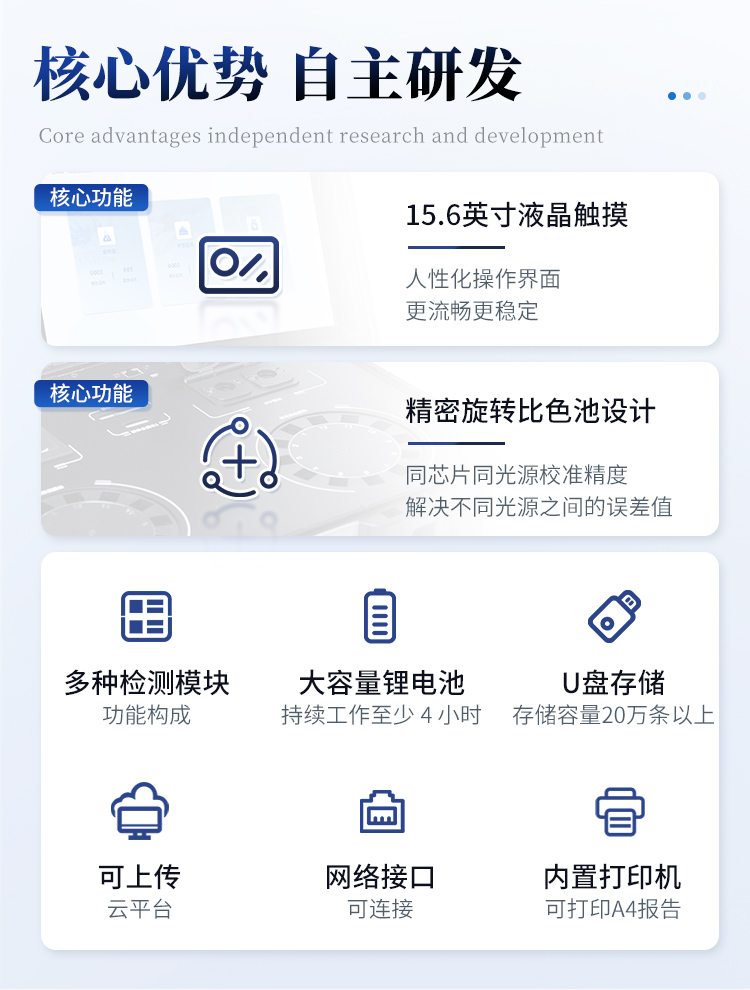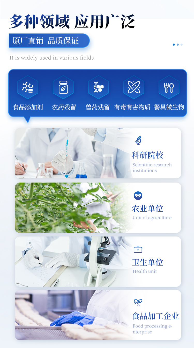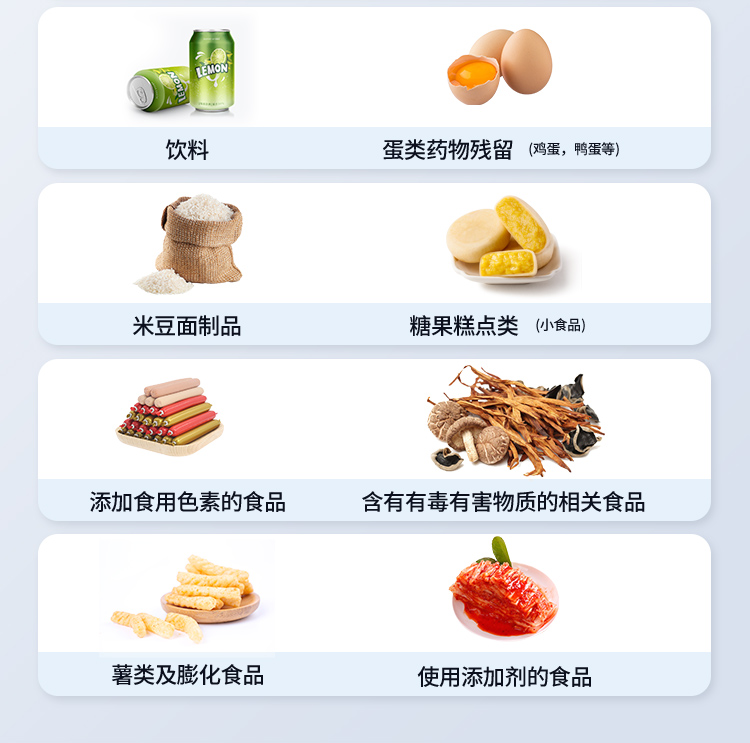 | 1. 功能構(gòu)成:主要包括分光光度模塊、新型農(nóng)殘檢測模塊、膠體金檢測模塊、熒光檢測模塊、數(shù)字化管理模塊等,所有模塊集成一體,可快速檢測200多種食品安全項(xiàng)目,如獸藥殘留、農(nóng)藥殘留、非法添加劑、細(xì)菌數(shù)值等指標(biāo)。 | 2. 檢測樣品種類:餐具及廚房用品、瓜果蔬菜及其制品、水產(chǎn)品及其制品、畜禽產(chǎn)品及其制品、嬰幼兒乳品及奶粉制品、蜂蜜、糧油及其制品、調(diào)味品(食醋、醬油、味精、鹽等)、酒類茶葉及其制品、食用菌、飲料、蛋類藥物殘留(雞蛋,鴨蛋等)、米豆面制品、糖果糕點(diǎn)類(小食品)、薯類及膨化食品、瓶(桶)裝飲用水、添加食用色素的食品、使用添加劑的食品、含有有毒有害物質(zhì)的相關(guān)食品。 | 3、顯示屏幕:儀器采用15.6英寸液晶觸摸屏顯,搭配運(yùn)行安卓智能操作系統(tǒng),主控芯片采用ARM Cortex-A7,RK3288/4核處理器,主頻1.88Ghz,操作方便,性能更強(qiáng)。 | 4、供電模式:儀器交直流兩用,直流12V供電,可連接車載電源,配18ah大容量充電鋰電池,電量可實(shí)時(shí)顯示,無外部電源條件下可持續(xù)工作至少 4 小時(shí)。 | 5、檢測通道:≥24通道;采用精密旋轉(zhuǎn)比色池設(shè)計(jì),使用同芯片同光源校準(zhǔn)精度,解決不同光源之間的誤差值,更加準(zhǔn)確**,采用高精度進(jìn)口四波長冷光源,每個通道均配置 410、520、590、630nm 波長光源,標(biāo)配**的光路切換裝置,專利光路切換功能可實(shí)現(xiàn)64波長,并且所有檢測項(xiàng)目可實(shí)現(xiàn)所有通道同時(shí)檢測. | 6、通訊接口:配備無線通信模塊、4G(APN)通訊模塊、藍(lán)牙傳輸,同時(shí)具有雙USB接口以及RJ45網(wǎng)線接口,可以多方式實(shí)現(xiàn)數(shù)據(jù)保存及數(shù)據(jù)傳輸。 | 7、存儲方式:支持U盤存儲,兩個標(biāo)準(zhǔn)USB接口,免驅(qū)動安裝。檢測結(jié)果存儲容量20萬條以上,可生成Excel表格進(jìn)行拷貝,并具有登錄保護(hù)功能。 | 8、操作系統(tǒng):儀器可在同一檢測界面自動對應(yīng)相關(guān)檢測通道,一次性選擇不少于11個樣品名稱,無需退出界面,節(jié)省操作時(shí)間。并可以對每個通道屬性和樣品信息單獨(dú)進(jìn)行編輯,例如送檢單位、人員,檢測人員等,打印時(shí)勾選打印顯示。 | 9、數(shù)據(jù)集成系統(tǒng):設(shè)備首頁自動匯總分析檢測數(shù)據(jù),包含:周檢測數(shù)據(jù)、月檢測數(shù)據(jù),全部檢測總數(shù)量,包含檢測總數(shù),合格數(shù),不合格數(shù),以及相關(guān)柱形分析圖,各項(xiàng)檢測數(shù)據(jù)一目了然,無需電腦查詢,更加快捷直觀。 | 10、數(shù)據(jù)庫系統(tǒng):十幾項(xiàng)數(shù)據(jù)庫分類管理儀器:包含項(xiàng)目類型、項(xiàng)目數(shù)據(jù)、檢測數(shù)據(jù)、歷史記錄、國標(biāo)信息、曲線信息、采樣信息、檢測信息、受檢信息、復(fù)核信息、圖表信息、光源校準(zhǔn)信息、打印樣式信息、樣品庫信息等等,數(shù)據(jù)庫之間互相協(xié)調(diào)聯(lián)動保證數(shù)據(jù)的真實(shí)完整性。同時(shí)產(chǎn)品數(shù)據(jù)庫以及歷史檢測記錄支持一鍵檢索功能。 | 11、限量規(guī)判系統(tǒng):具有限量查詢、添加物質(zhì)合規(guī)判定系統(tǒng)。檢測出結(jié)果后,系統(tǒng)自動調(diào)用系統(tǒng)數(shù)據(jù)庫中相關(guān)國標(biāo)進(jìn)行比對判定,客觀顯示判定結(jié)果是否合格。 | 12、項(xiàng)目預(yù)設(shè)系統(tǒng):儀器具有任務(wù)預(yù)設(shè)模塊,一鍵提前預(yù)設(shè),給出方便快捷的新檢測方案,每一個任務(wù)分別可以設(shè)置不同的樣品、批次、編號、來源、備注、抽樣信息、檢測信息、受檢信息、復(fù)核信息等更多信息。樣品送檢時(shí)一鍵調(diào)取保存信息,并可多次調(diào)取,適用于大批量檢測業(yè)務(wù),可以大大提高檢測效率。 | 13、數(shù)據(jù)監(jiān)管系統(tǒng):同步對接監(jiān)管平臺,數(shù)據(jù)可局域網(wǎng)和互聯(lián)網(wǎng)數(shù)據(jù)上傳,檢測結(jié)果可直接傳至食品安全監(jiān)管平臺。進(jìn)行區(qū)域食品安全監(jiān)管及大數(shù)據(jù)分析處理與數(shù)據(jù)統(tǒng)計(jì),監(jiān)測區(qū)域食品安全長短期動態(tài)及問題預(yù)估、預(yù)警。 | 14.1、全新打印系統(tǒng):內(nèi)置全新打印機(jī),新創(chuàng)自定義打印方式,可按需靈活勾選控制:產(chǎn)品合格證(國家農(nóng)業(yè)部標(biāo)準(zhǔn)要求),二維碼,抽樣信息、檢測信息,受檢信息、復(fù)核信息、抽樣日期、檢測日期等信息的打印。 | 14.2、A4紙版本報(bào)告打印功能:設(shè)備擁有兩種結(jié)果展示方式,可以自動生成A4打印模板和小票打印模板兩種樣式,可通過WiFi及網(wǎng)線等方式連接外置打印機(jī)可進(jìn)行打印。 | 15、膠體金檢測模塊:采用單通道CMOS成像處理技術(shù)及膠體金免疫層析技術(shù),可讀取膠體金卡數(shù)據(jù),自動采集、處理分析,將檢測結(jié)果顯示,并可根據(jù)參考限值自動判斷檢測結(jié)果,可檢測常見的獸藥殘留、生物毒素、抗生素、違禁添加物等。 | 15.1、可即時(shí)檢測單聯(lián)卡及三聯(lián)卡; | 15.2、檢測通道:2個通道; | 15.3、檢測方式:消線法和比色法; | 15.4、顯示模式:陰性或陽性; | 15.5、曲線形式:插入式掃描方式,顯示金