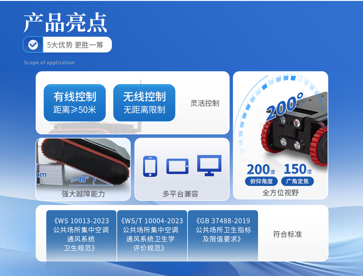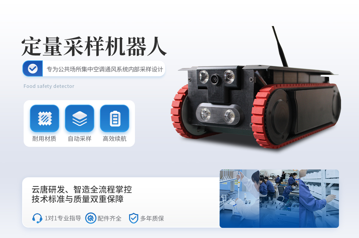 定量采樣機器人是一款專為公共場所集中空調通風系統內部采樣設計的高精度、便攜式智能設備。該產品嚴格按照《WS 10013-2023公共場所集中空調通風系統衛生規范》、《WS/T 10004-2023公共場所集中空調通風系統衛生學評價規范》以及《GB 37488-2019公共場所衛生指標及限值要求》中的相關標準進行設計與制造,確保了其在各種工業環境下的穩定性和可靠性。它采用了**的航空鋁合金材料,結合了**的移動性能與卓越的采樣技術,能夠滿足多種行業的通風管道檢測和維護工作需求。