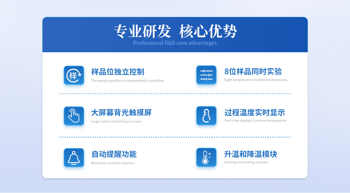 ◆ 全樣品位:28位,◆ 可同時滿足制膠過程和冰水浴操作。制膠和冰水浴可在屏上獨立操控,互不影響。◆ 制膠控制,通過無級控溫旋鈕控制加熱功率,安全制膠。◆ 水位自動檢測功能:自動檢測水位,缺水自動停止。◆ 自動進排水:自動進排水。◆ 控溫精度:±0.1℃◆ 沸點自動檢測 不同地區不同大氣壓下自動檢測當下環境的沸點,提醒加樣。◆ 提醒功能: