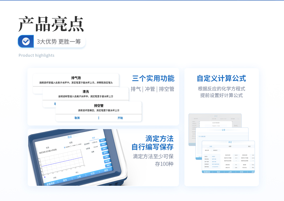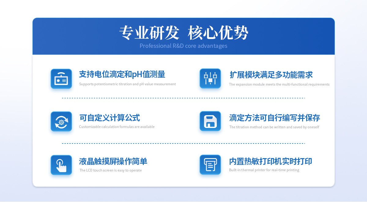 產品簡介:自動電位滴定儀是一種用于化學分析的精密儀器,他通過自動添加滴定劑來確定樣品中特定成分的濃度。該儀器基于電位滴定原理工作,即根據在滴定過程中電池電動勢的變化來確定滴定終點的一款滴定設備。設備滿足國家檢定規程JJG 814-2015《自動電位滴定儀》儀器級別中的0.05級別,即儀器**示值誤差為±1.5%,儀器示值2026-04-14