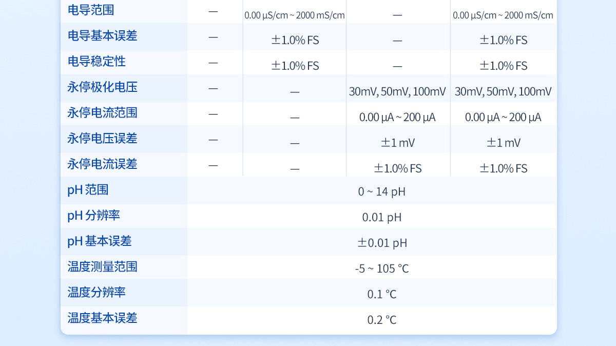 滴定分析重復性:≤0.2%滴定分析誤差:≤1.5%10mL滴定管滴定容量精度:±5μL20mL滴定管滴定容量精度:±10μL10mL滴定管滴定容量誤差:10μL/10mL20mL滴定管滴定容量誤差:20μL/10mL電位范圍:-2000—2000mV電位分辨率:0.1mV電位基本誤差mV:±0.25‰/FS電位穩定性mV:±0.3mV/3h永停極化電壓:30mV、50mV、100mV永停電流范圍:0.00uA-200uA永停電壓誤差:±1mV永停電流誤差:±1.0% FSpH范圍:0-14PHpH分辨率:0.01PHpH基本誤差:±0.01PH溫度測量范圍:-5 - 105℃溫度分辨率:0.1℃溫度基本誤差:0.2℃