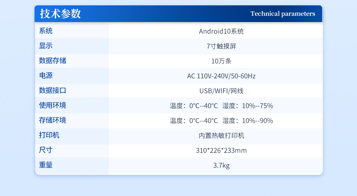 系統:Android10系統顯示:7寸觸摸屏數據存儲:10萬條電源:AC 110V-240V/50-60Hz數據接口:USB/WIFI/網線使用環境:溫度:0℃--40℃   濕度:10%--75%存儲環境:溫度:0℃--40℃   濕度:10%--90%打印機:內置熱敏打印機尺寸:310*226*233mm重量:3.7kg