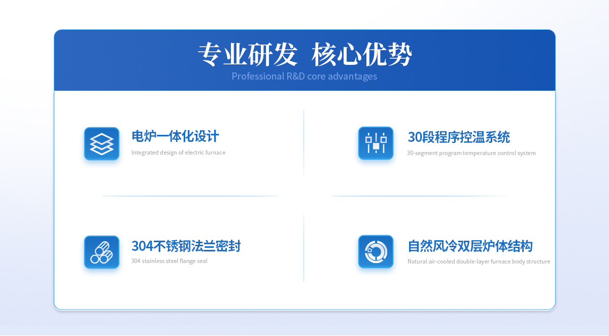1、爐膛采用優質氧化鋁纖維材料,保溫性能好,耐用,拉伸強度高,無雜球,純度高,節能效果明顯;2、加熱元件采用優質HRE電阻絲,大大提高了其使用壽命;3、超溫報警,漏電保護,操作安全可靠。