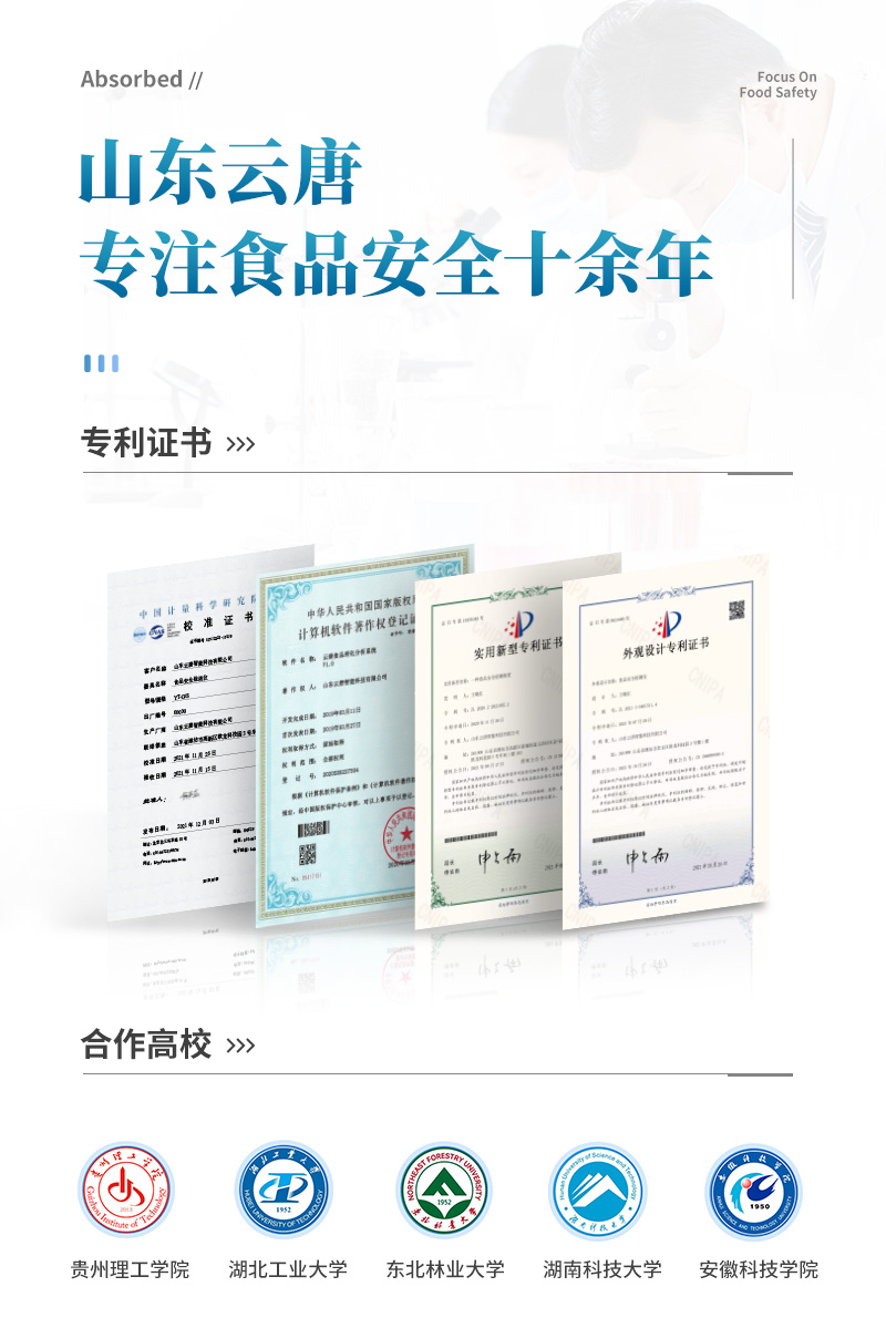 山東云唐智能科技有限公司生產(chǎn)的果蔬肉類檢測儀,采用手提箱式一體化設(shè)計,可快速檢測幾十種項目,包含各種蔬菜水果中有機磷和氨基甲酸酯類農(nóng)藥殘留,病害肉診斷:肉中組胺、揮發(fā)性鹽基氮;各種肉食品中瘦肉精激素類殘留、抗生素、獸藥殘留等現(xiàn)場的定性定量檢測。 該果蔬肉類檢測儀為集成化食品安全快速檢測分析設(shè)備,目前已于食藥監(jiān)局、衛(wèi)生部門、高教院校、科研院所、農(nóng)業(yè)部門、養(yǎng)殖場、屠宰場、食品肉產(chǎn)品深加工企業(yè)及檢驗檢疫部門等單位廣泛使用。