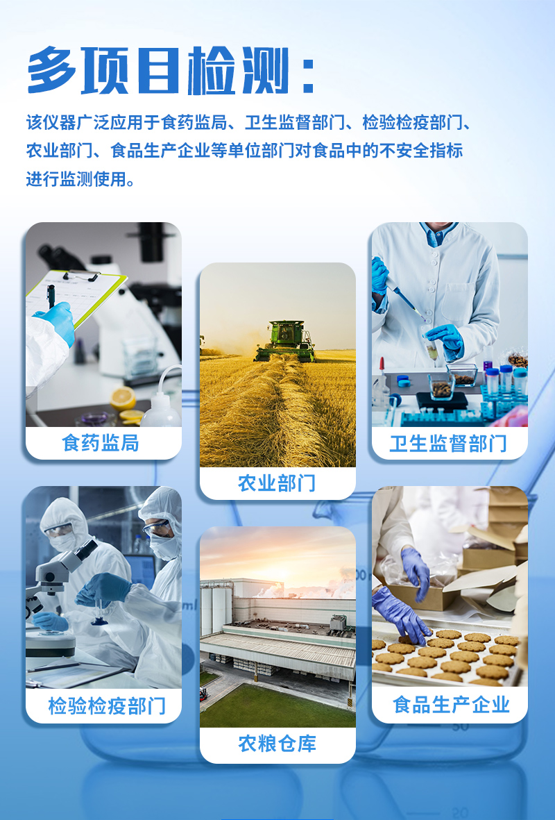 金標(biāo)度數(shù)儀快速定量檢測獸藥殘留、抗生素類殘留、激素類殘留、毒素類殘留,化學(xué)類殘留等幾十種項目并可根據(jù)用戶需要擴充新的檢測項目如農(nóng)藥殘留、食品添加劑、色素、可現(xiàn)場快速檢測農(nóng)藥殘留、鹽酸克倫特羅、沙丁胺醇、萊克多巴胺、四環(huán)素類、硝基呋喃類、磺胺類、沙星類、氯霉素、孔雀石綠磺胺類、豬藍耳病毒、豬瘟病毒、黃曲霉毒素B1、豬偽狂犬病毒、豬偽狂犬病毒gE蛋白、豬口蹄疫3ABC蛋白、豬口蹄疫病毒IgG、豬細小病毒、雞禽流感等定性和定量快速檢測等、并且可以連接食品安全監(jiān)控系統(tǒng)。