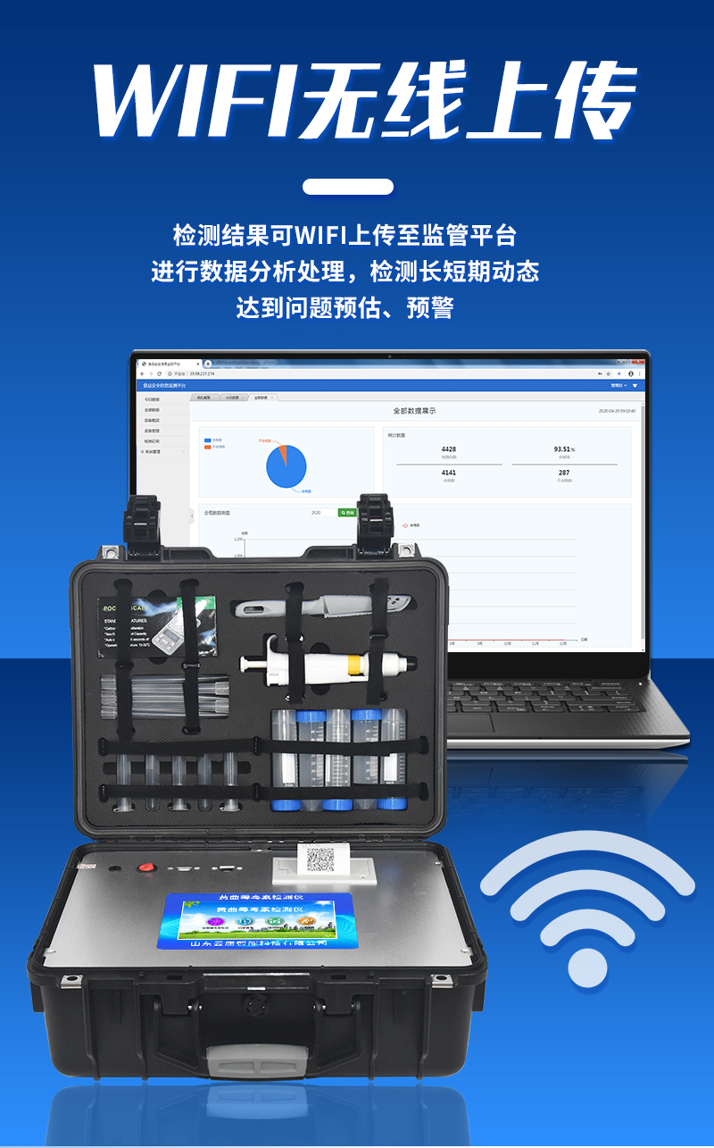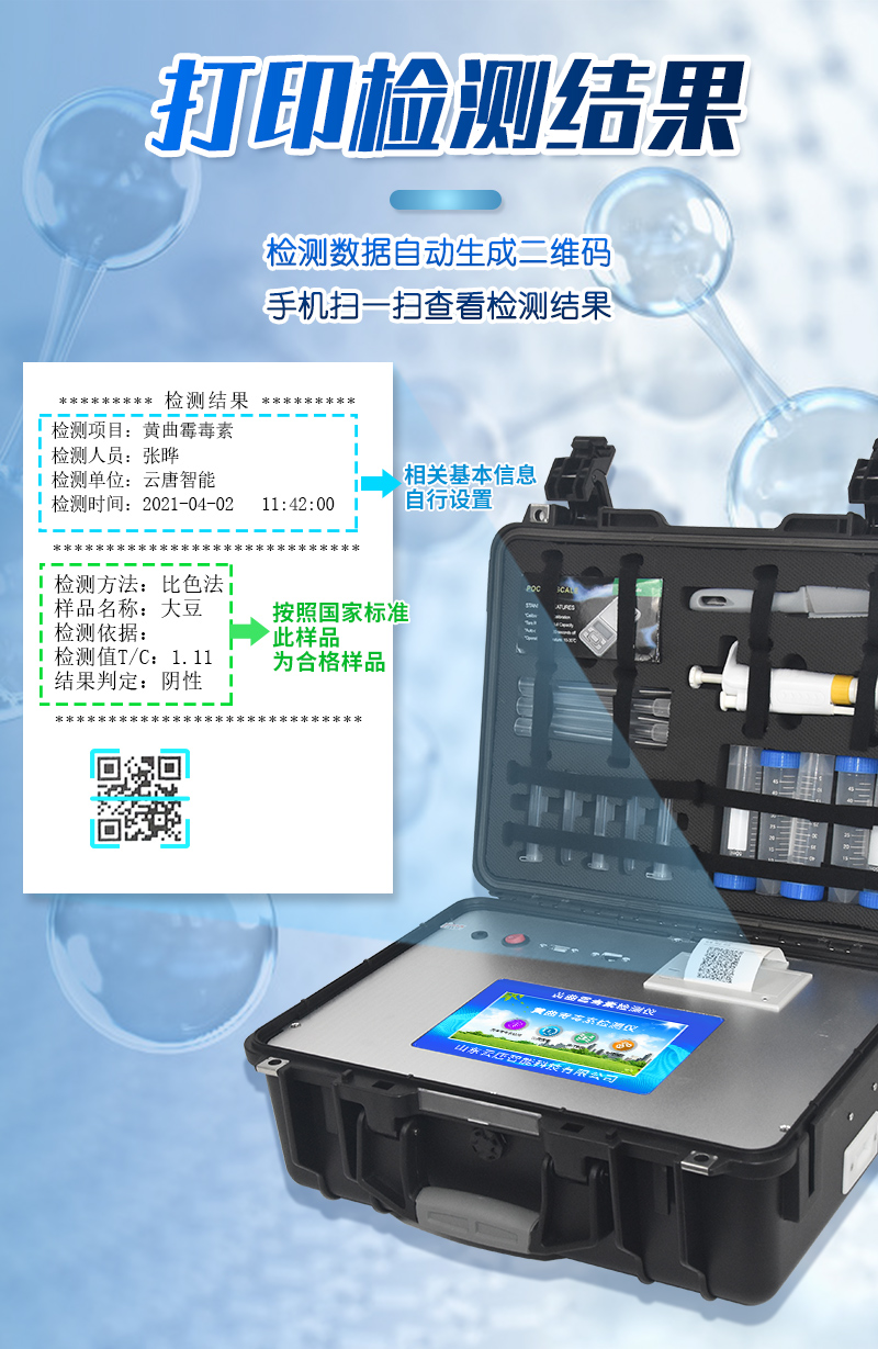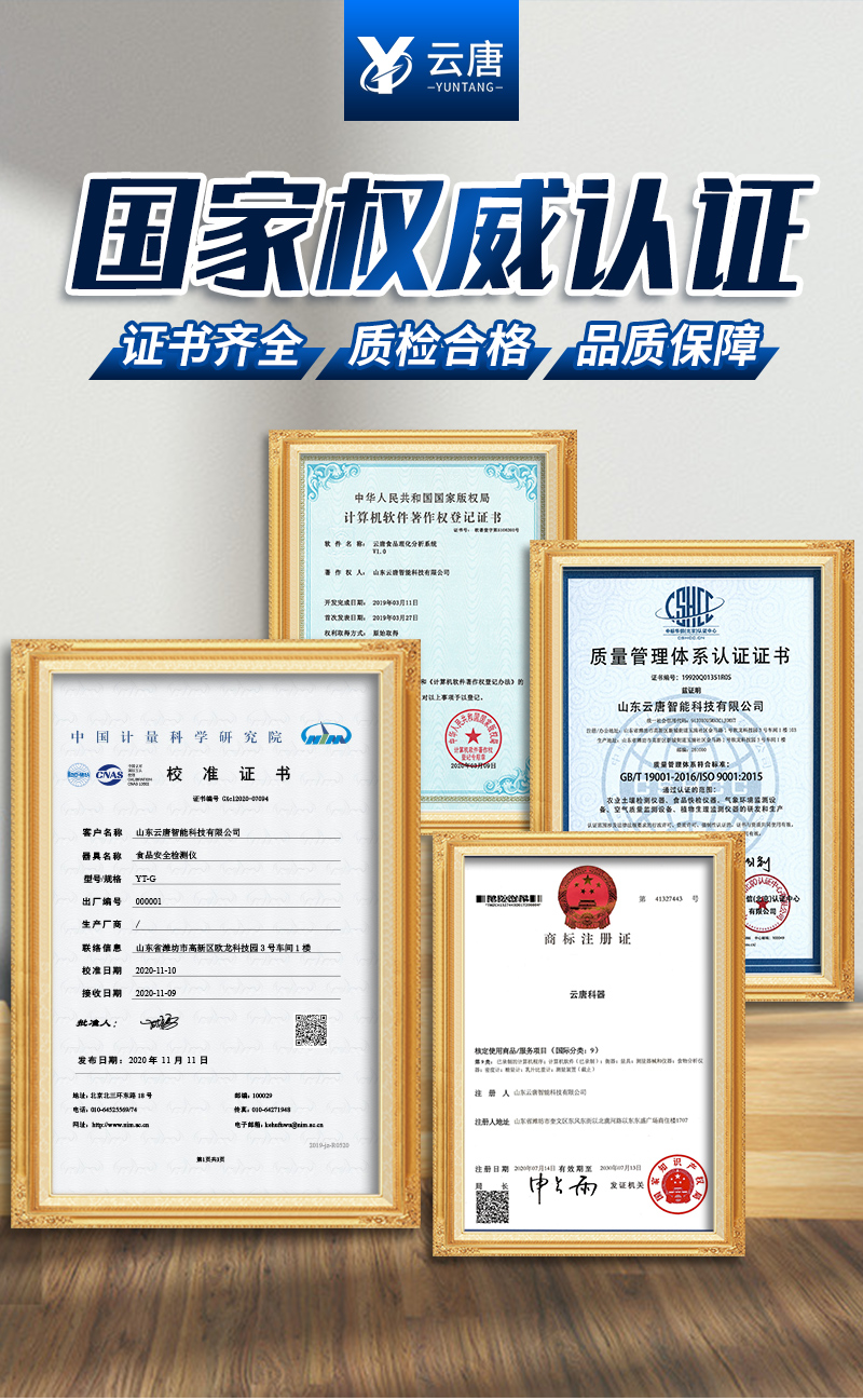 | 工作模式:安卓5.1系統(tǒng)模式 | 軟件支持:安卓軟件平臺 | ☆檢測項目:可檢測農(nóng)藥殘留、食品添加劑、色素、可現(xiàn)場快速檢測農(nóng)藥殘留、鹽酸克倫特羅、沙丁胺醇、萊克多巴胺、四環(huán)素類、硝基呋喃類、磺胺類、沙星類、氯霉素、孔雀石綠磺胺類,并且可以連接食品安全監(jiān)控系統(tǒng)。 | 測量原理:光電池測量反射衰減信號強度; | 測量速度:≤5s; | 儲存功能:儲存至少20000個結(jié)果數(shù)據(jù),支持自定義查詢; | 藍牙模塊:藍牙4.2 | 檢測精度:CV值小于1%(標(biāo)準(zhǔn)卡),批間差小于3%(標(biāo)準(zhǔn)卡); | 檢測輸出:支持色度檢測,CT比值檢測,T線檢測等多種擬合方式; | 內(nèi)置熱敏打印機 | ☆數(shù)據(jù)輸出:內(nèi)置WIFI,支持無線數(shù)據(jù)上傳,標(biāo)準(zhǔn)RS232串口,網(wǎng)絡(luò)接口和USB2.0接口; | ☆內(nèi)置食品安全信息系統(tǒng),一鍵數(shù)據(jù)上傳。 | 儀器外形尺寸:300*250*79mm | ☆操作系統(tǒng)配置:7吋液晶屏、4核處理器、1600萬像素 | 凈重:2.0kg。 |