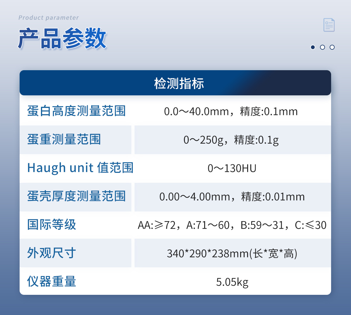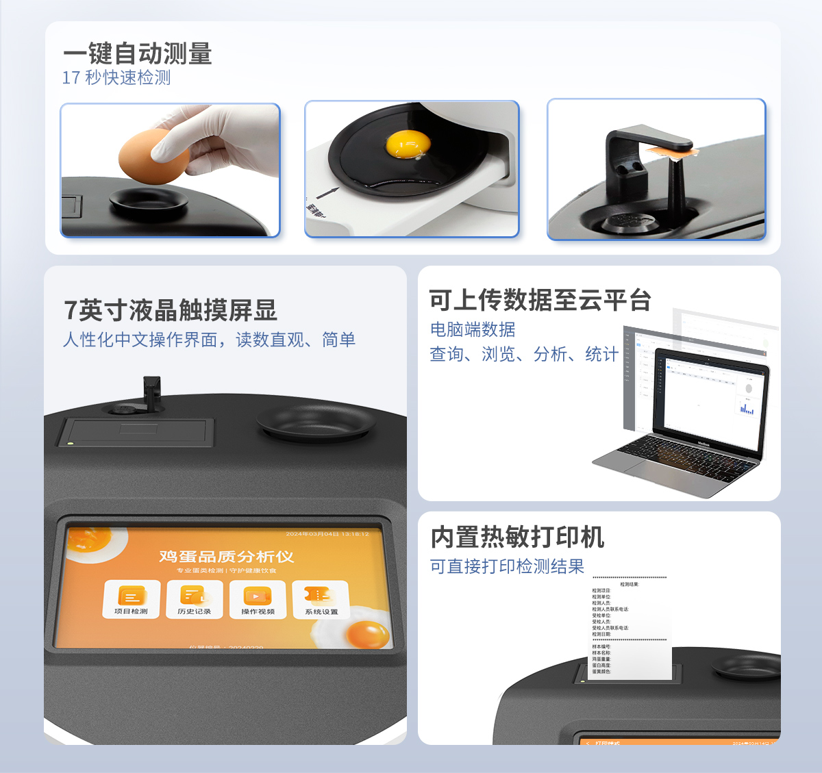 1.儀器采用7英寸液晶觸摸屏,搭配運行安卓智能操作系統,主控芯片采用ARM Cortex-A7,RK3288/4核處理器,主頻1.88Ghz,操作方便,性能更強。 2.儀器采用智能化控制,可一鍵自動測量蛋重、蛋白高度、新鮮度(哈夫單位)、蛋黃高度、蛋殼厚度。 3.高精度數字傳感器,測量結果精度高,穩定性好。 4.創新采用高精超聲波傳感器測試蛋白高度,精密傳感器測試蛋黃顏色,無需直接接觸蛋液,減少誤差存在。 5.儀器測試性能穩定,不受操作人員的能力影響,方便簡單。 6.可一鍵自動測量哈夫單位、蛋重、蛋白高度、蛋黃高度和蛋殼厚度,把測試時間縮短到 17 秒。 7.儀器可本機存儲數據,可連接USB端口將數據導出存儲。另外,儀器自帶數據上傳模塊,具有WIFI聯網上傳、RJ45網線連接功能,數據可實現局域網和互聯網數據上傳,檢測結果可選擇直接傳至數據平臺,進行大數據分析處理與數據統計,達到長期分析監測的目的。 8.打印系統:內置全新打印機,可以打印項目名稱、二維碼、抽樣信息、檢測信息、受檢信息、復核信息、抽樣日期、檢測日期等信息。 9.供電模式:儀器交直流兩用,直流12V供電(標配),可連接車載電源,亦可選配6ah大容量充電鋰電池,方便戶外流動測試。 10.儀器具有重新校準、鎖定功能。 11.檢測指標: (1)蛋白高度測量范圍:0.0~40.0mm,精度:0.1mm ; (2)蛋重測量范圍:0~250g,精度:0.1g ; (3) Haugh unit 值范圍:0~130HU; (4)國際等級:AA:≥72,A:71~60,B:59~31,C:≤30; 12.外觀尺寸:340*290*238mm(長*寬*高),儀器重量:5.05kg。