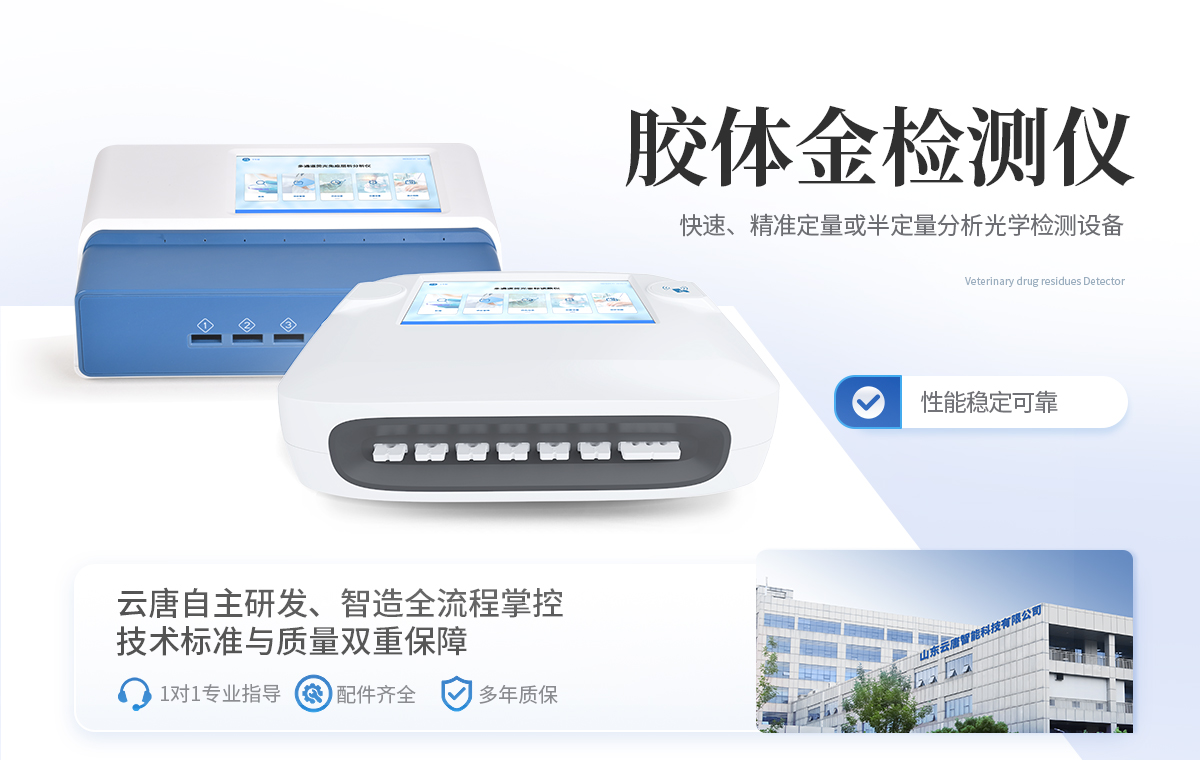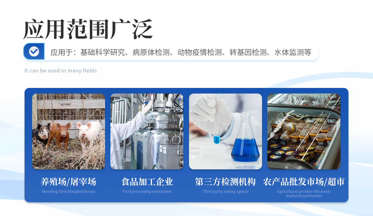 | 1、食品安全: 致病微生物、農(nóng)獸藥殘留、生物毒素等快速篩查。 | 2、畜牧獸醫(yī): 動物疫病診斷、動物源性安全指標檢測。 | 3、環(huán)境監(jiān)測: 水質、土壤特定污染物篩查。 | 4、科研與生物安全: 免疫層析實驗定量分析、生物因子檢測。 | 5、其他領域: 所有使用膠體金免疫層析試紙條的場景。 |
