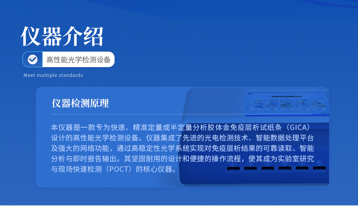 | 本儀器是一款專為快速、精準定量或半定量分析膠體金免疫層析試紙條(GICA)設計的高性能光學檢測設備。儀器集成了**的光電檢測技術、智能數(shù)據(jù)處理平臺及強大的網(wǎng)絡功能,通過高穩(wěn)定性光學系統(tǒng)實現(xiàn)對免疫層析結果的可靠讀取、智能分析與即時報告輸出。其堅固耐用的設計和便捷的操作流程,使其成為實驗室研究與現(xiàn)場快速檢測(POCT)的核心儀器。 |