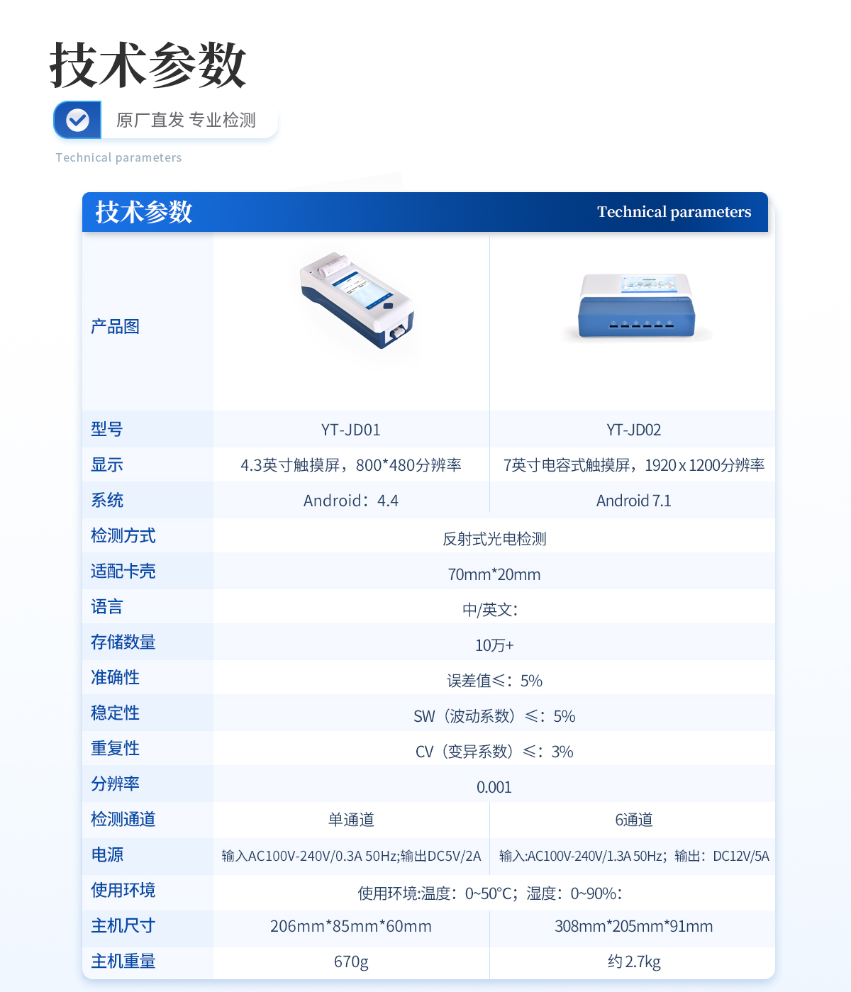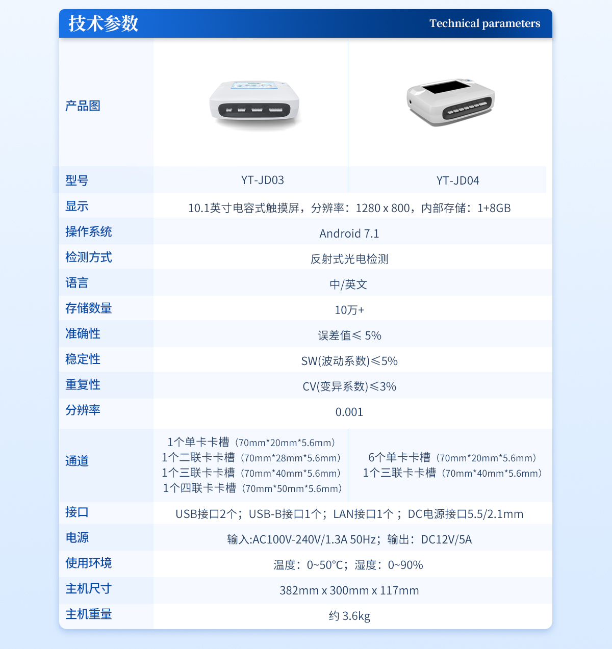 | 1、 屏幕:4.3英寸觸摸屏,分辨率:800*480,內部存儲:1+8GB | 2、 操作系統(tǒng):Android:4.4 | 3、 檢測方式:反射式光電檢測 | 4、 適配卡殼:70mm*20mm | 5、 語言:中/英文: | 6、 存儲數(shù)量:10萬+ | 7、 準確性:誤差值≤:5% | 8、 穩(wěn)定性:SW(波動系數(shù))≤:5% | 9、 重復性:CV(變異系數(shù))≤:3% | 10、 分辨率:0.001 | 11、 檢測通道:單通道 | 12、 檢測時間:<:5秒;可對樣本進行膠體金定性/半定量檢測 | 13、 插卡判斷:檢測卡未插入檢測通道不能檢測 | 14、 數(shù)據(jù)傳輸:WiFi、藍牙、Type-C | 15、 數(shù)據(jù)處理:可通過通訊端口進行數(shù)據(jù)匯總、上傳監(jiān)管平臺等 | 16、 檢測通道孵育檢測一體,溫度范圍::室溫:+5℃:~:60℃ | 17、 打印機:熱敏打印機(熱敏打印紙:57*20mm) | 18、 電源:輸入AC100V-240V/0.3A 50Hz;輸出DC5V/2A | 19、 電池容量:6000mah: | 20、 顯示電量 | 21、 使用環(huán)境:溫度:0~50℃;濕度:0~90%: | 22、 主機尺寸::206mm*85mm*60mm | 23、 主機重量:670g |