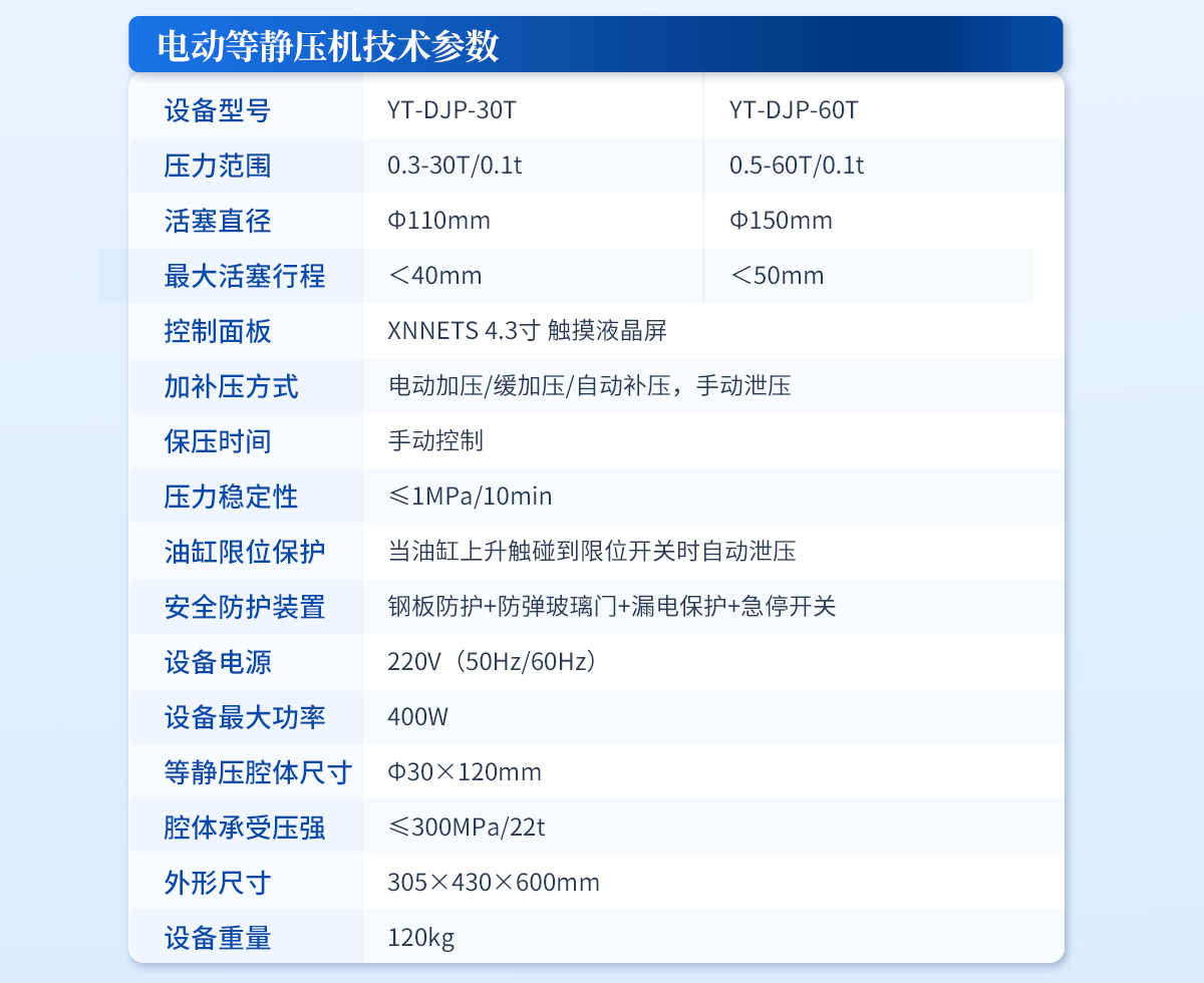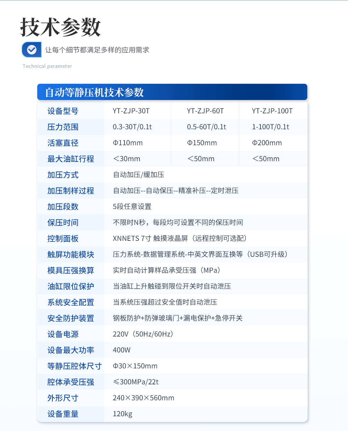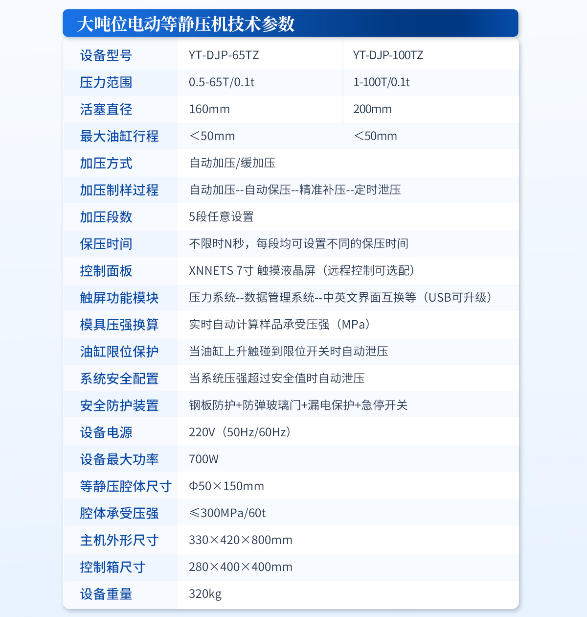 | 規(guī)格型號:YT-ZJP-100T | 壓力范圍:1-100T/0.1t | 活塞直徑 :Φ200mm | **油缸行程:<50mm | 加壓方式:自動加壓/緩加壓 | 加壓制樣過程:自動加壓--自動保壓--精準(zhǔn)補(bǔ)壓--定時泄壓 | 加壓段數(shù):5段任意設(shè)置 | 保壓時間 :不限時N秒,每段均可設(shè)置不同的保壓時間 | 控制面板:XNNETS 7寸 觸摸液晶屏(遠(yuǎn)程控制可選配) | 觸屏功能模塊: 壓力系-統(tǒng)-數(shù)據(jù)管理系統(tǒng)--中英文界面互換等(USB可升級) | 模具壓強(qiáng)換算:實時自動計算樣品承受壓強(qiáng)(MPa) | 油缸限位保護(hù):當(dāng)油缸上升觸碰到限位開關(guān)時自動泄壓 | 系統(tǒng)安全配置 :當(dāng)系統(tǒng)壓強(qiáng)超過安全值時自動泄壓 | 安全防護(hù)裝置:鋼板防護(hù)+防彈玻璃門+漏電保護(hù)+急停開關(guān) | 設(shè)備電源:220V(50Hz/60Hz) | 設(shè)備**功率:400W | 等靜壓腔體尺寸:Φ60×150mm | 腔體承受壓強(qiáng): ≤300MPa/87t | 外形尺寸:330×580×720mm | 設(shè)備重量:290kg | 配置說明:等靜壓機(jī)1臺!可根據(jù)需求定制500MPa等靜壓機(jī)或橡膠模具 |