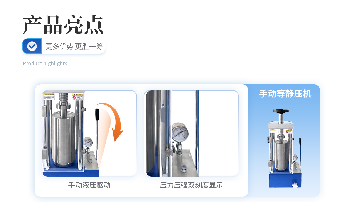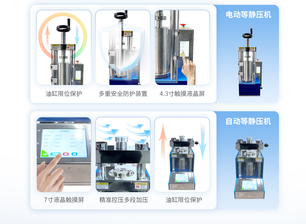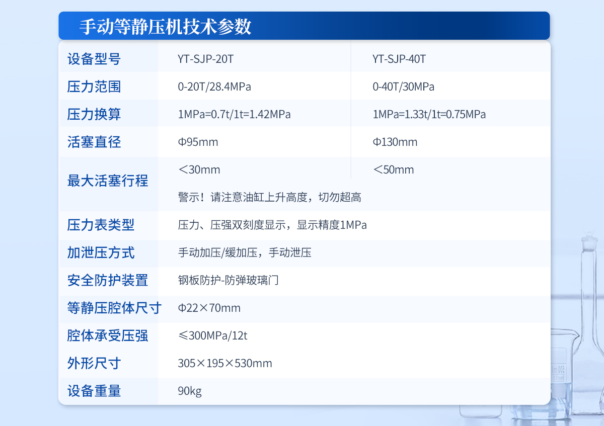 | 規(guī)格型號:YT-ZJP-100T | 壓力范圍:1-100T/0.1t | 活塞直徑 :Φ200mm | **油缸行程:<50mm | 加壓方式:自動加壓/緩加壓 | 加壓制樣過程:自動加壓--自動保壓--精準(zhǔn)補(bǔ)壓--定時泄壓 | 加壓段數(shù):5段任意設(shè)置 | 保壓時間 :不限時N秒,每段均可設(shè)置不同的保壓時間 | 控制面板:XNNETS 7寸 觸摸液晶屏(遠(yuǎn)程控制可選配) | 觸屏功能模塊: 壓力系-統(tǒng)-數(shù)據(jù)管理系統(tǒng)--中英文界面互換等(USB可升級) | 模具壓強(qiáng)換算:實時自動計算樣品承受壓強(qiáng)(MPa) | 油缸限位保護(hù):當(dāng)油缸上升觸碰到限位開關(guān)時自動泄壓 | 系統(tǒng)安全配置 :當(dāng)系統(tǒng)壓強(qiáng)超過安全值時自動泄壓 | 安全防護(hù)裝置:鋼板防護(hù)+防彈玻璃門+漏電保護(hù)+急停開關(guān) | 設(shè)備電源:220V(50Hz/60Hz) | 設(shè)備**功率:400W | 等靜壓腔體尺寸:Φ60×150mm | 腔體承受壓強(qiáng): ≤300MPa/87t | 外形尺寸:330×580×720mm | 設(shè)備重量:290kg | 配置說明:等靜壓機(jī)1臺!可根據(jù)需求定制500MPa等靜壓機(jī)或橡膠模具 |