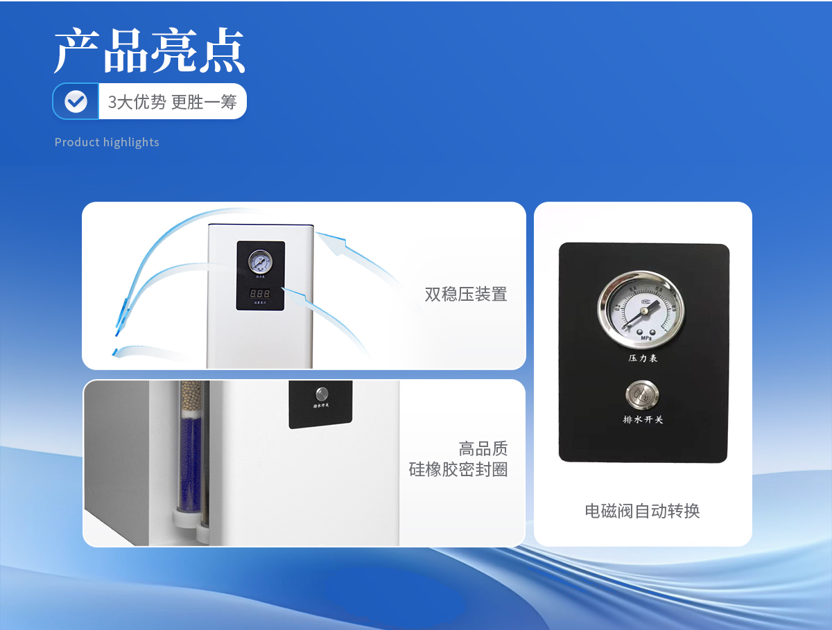 1、雙穩(wěn)壓裝置,確保高精度穩(wěn)壓條件下氣體流量的穩(wěn)定性。 2、電磁閥自動轉(zhuǎn)換,徹底杜絕了電磁閥在自動放水時產(chǎn)生的連續(xù)噪音,實現(xiàn)放水、轉(zhuǎn)換一體化。 3、儀器內(nèi)部采用硅橡膠圈,含硫量低有效提高氣體質(zhì)量,保證色譜基線穩(wěn)定。 4、體積小,雙支FV型亞克力過濾器,耐壓高,不會因工作環(huán)境及腐蝕氣體的影響,導(dǎo)致過濾管變形,開裂而產(chǎn)生漏氣現(xiàn)象,可持久使用,一勞永逸。