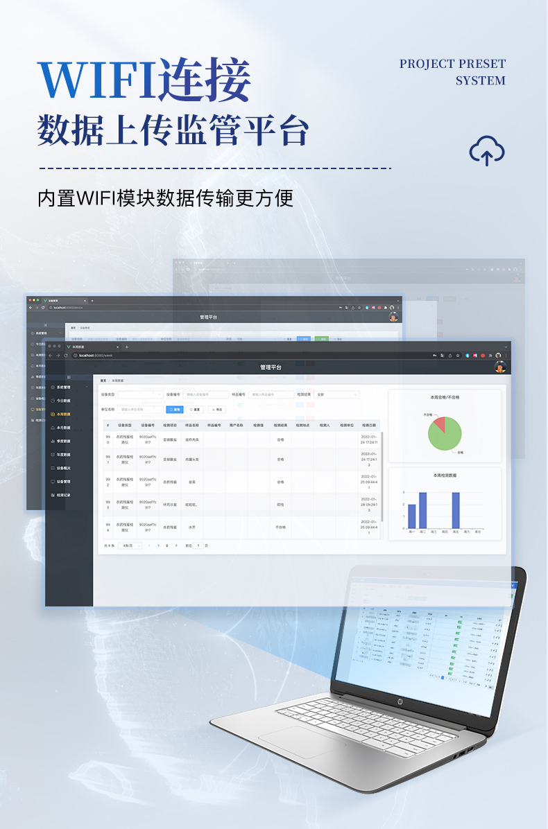 4、儀器帶有監管平臺。數據可局域網和互聯網數據上傳,檢測結果直接傳至食品安全監管平臺。進行區域食品安全監管及大數據分析處理與數據統計,檢測區域食品安全長短期動態,達到食品安全問題預估、預警。