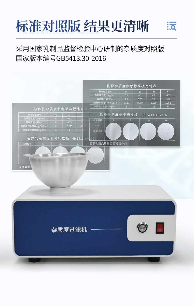 | 用途:用于乳及乳制品中雜質度的測定。 | 標準依據:符合國家標準 GB/T5413.1—5413.32,特別是 GB5413.30-2016 的要求。 |