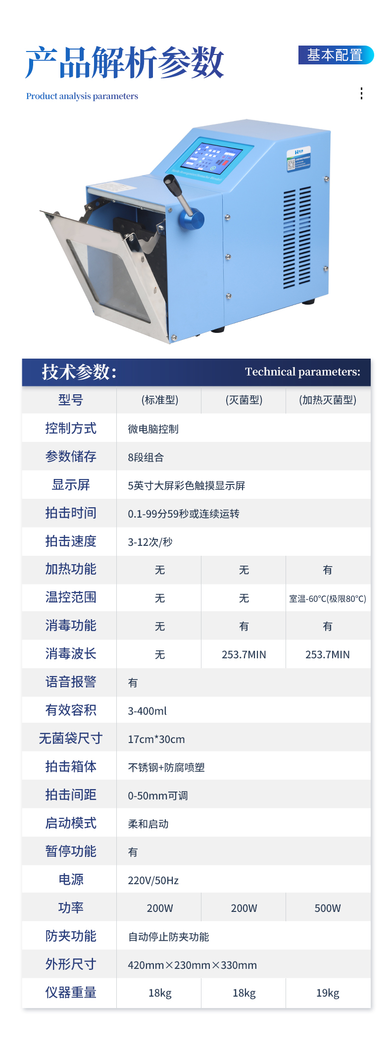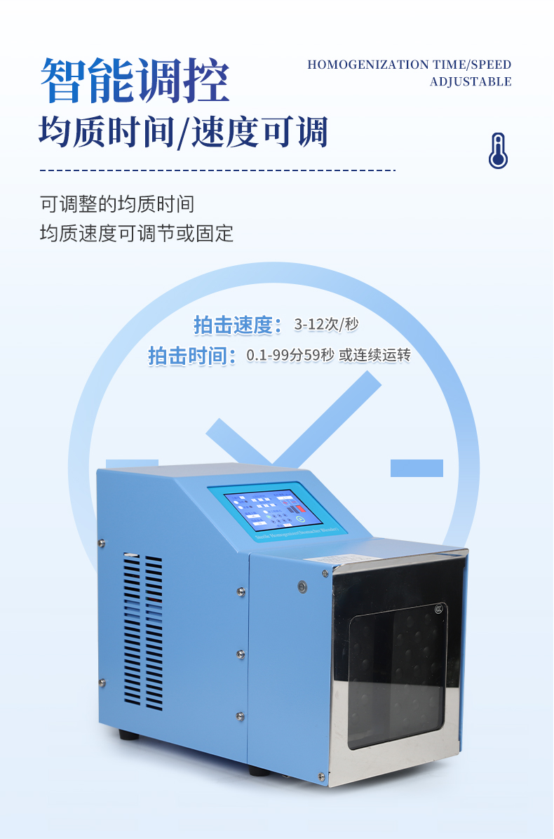 ●5英寸液晶顯示屏。 ●可儲存三組工作程序。 ●可調整的均質時間。 ●均質速度可調節或固定。 ●拍擊器可調整前后距離。 ●無菌一次性濾袋,保證衛生。 ●全開啟式門,易于清洗。 ●玻璃透明窗口易于觀察 。 ●樣品與均質儀無接觸,如無樣品泄露則不需進行系統清洗. ●均質柔和、樣品零污染、無損傷、不升溫、不需要滅菌處理,不需洗刷器皿。
