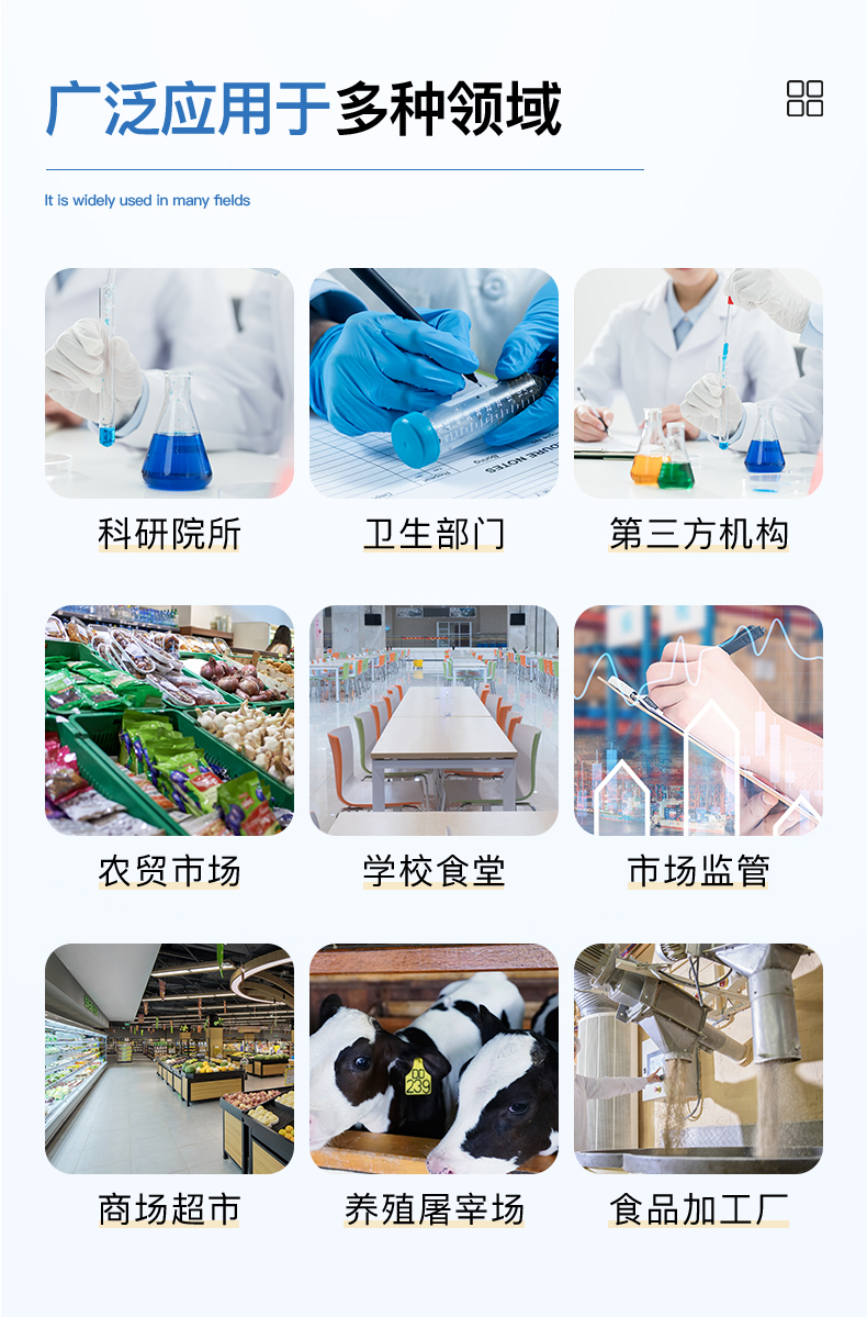 該多功能食品安全檢測儀為集成化食品安全快速檢測分析設備,廣泛應用于食藥監局、衛生部門、高教院校、科研院所、農業部門、養殖場、屠宰場、食品肉產品深加工企業、檢驗檢疫部門等單位使用。