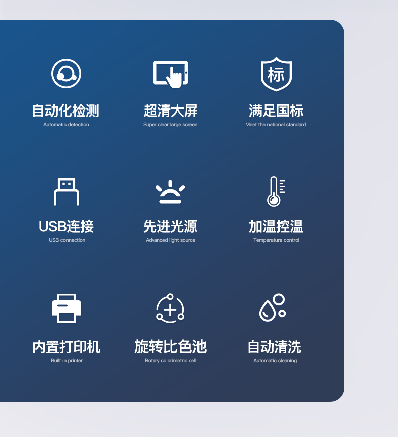 | 人性化界面,操作方便 | 儀器按照試劑要求自動、按時、按量加入試劑,提高工作效率 | 儀器自動對未正常放置的樣本或異常的樣本進行檢查并提示 | 采用**的冷光源,保證了光源的穩定性及數據的準確性 | 大容量存儲器,能存儲12萬條數據,滿足客戶需求 | 內置微型熱敏打印機,快速打印檢測結果,方便數據留存 | 可通過數據線連接電腦,將檢測的數據上傳至電腦端 | 儀器可自動清洗管路,避免試劑污染 | 儀器檢測消耗試劑量和常規儀器一致 | 儀器具有自動加溫溫控系統 |