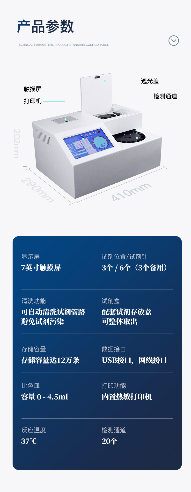 | 波長配置:410 | 試 劑 針:3根 | 檢測通道:20個 | 反應溫度:37℃,儀器具有自動加溫溫控系統 | 觸 摸 屏:7寸觸摸屏,可單機操作 | 比 色 皿:容量 0 - 4.5ml | 試 劑 盒:配套試劑存放盒,可整體取出 | 清洗功能:可自動清洗試劑管路,避免試劑污染 | 加樣功能:儀器按照試劑要求自動、按時、按量加入試劑,提高工作效率 | 自動混勻:儀器測試過程中自動震蕩混勻保證試劑充分反應 | 實時監控:儀器測試過程中顯示實時運行狀態 | 打印功能:內置熱敏打印機,可快速打印檢測結果,方便數據留存 | 數據存儲:大容量存儲器,能存儲12萬條數據 | 數據接口:外接USB接口,網線接口 | 網絡連接:可連接有線網絡和無線wifi | 上位機軟件:儀器配套電腦端上位機軟件,可通過軟件進行寫入參數及讀取數據 | 樣本檢測:儀器自動對未正常放置的樣本或異常的樣本進行檢查并報警提示 | 試劑檢測:儀器測試前和測試過程中時刻對試劑進行檢查,檢查試劑是否缺失,如有異常儀器會進行報警提示,對已經加入試劑的樣本進行正常測試,不影響測試結果,對未測試的樣本停止測試。 | 數據上傳:儀器數據可傳入電腦端,按照客戶需求進行保存或打印 | 儀器重量:約7KG | 儀器尺寸:410mm*290mm*202mm |
