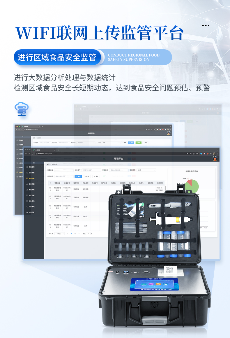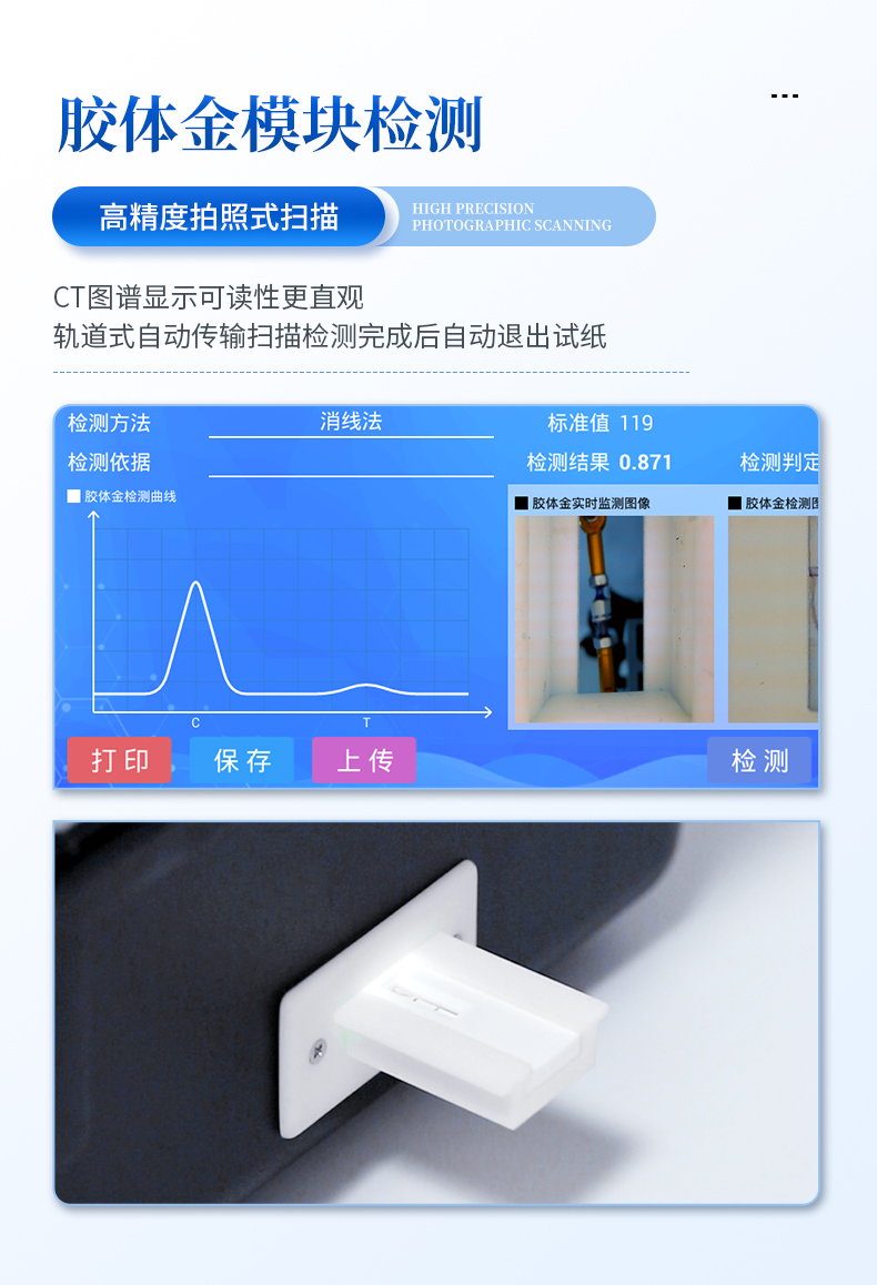 | 安卓智能操作系統(tǒng),采用更加**UI交互界面,儀器具有wifi聯(lián)網(wǎng)上傳、4G聯(lián)網(wǎng)傳輸、GPRS無線遠(yuǎn)傳、網(wǎng)線連接功能,快速批量上傳數(shù)據(jù)。 | 智能化程度高,儀器具有自檢功能:具有開機(jī)自檢和調(diào)零功能,具有自動(dòng)檢測重復(fù)性功能。 | 新一代高速熱敏打印機(jī),檢測完成可自動(dòng)打印檢測報(bào)告和二維碼。 | 儀器帶有監(jiān)管平臺(tái),數(shù)據(jù)可局域網(wǎng)和互聯(lián)網(wǎng)數(shù)據(jù)上傳,檢測結(jié)果直接傳至食品安全監(jiān)管平臺(tái)。進(jìn)行區(qū)域食品安全監(jiān)管及大數(shù)據(jù)分析處理與數(shù)據(jù)統(tǒng)計(jì),檢測區(qū)域食品安全長短期動(dòng)態(tài),達(dá)到食品安全問題預(yù)估、預(yù)警 | 一體化便攜式快檢設(shè)備,滿足現(xiàn)場及流動(dòng)檢測使用需求,能夠在同一軟件下實(shí)現(xiàn)所有檢測項(xiàng)目的檢測,并可通過同一窗口直觀顯示檢測結(jié)果。 | 膠體金模塊檢測方式:軌道式自動(dòng)傳輸掃描,檢測完成后自動(dòng)退出檢測卡。 | 一體化主機(jī),包含食品安全檢測模塊、多通道農(nóng)藥殘留檢測模塊、膠體金免疫層析檢測模塊。 | CT線自動(dòng)識(shí)別,無需手動(dòng)調(diào)整。 | 儀器具有品類多種類樣品菜單庫,可靈活選擇檢測樣品,不同的檢測通道可同時(shí)檢測不同的樣品項(xiàng)目。。 | 樣品處理簡單省力,整體操作快速、安全、便捷。 | 儀器具有自身保護(hù)功能,可設(shè)置用戶名及密碼,防止非工作人員操作等。 | 高靈敏度,高檢測精度,高重復(fù)性精度,掃描式高精度光學(xué)傳感器。 | 儀器具有重新校準(zhǔn)、鎖定、恢復(fù)出廠設(shè)置功能。 | 內(nèi)置強(qiáng)大的數(shù)據(jù)庫,可在儀器上直接選擇樣品名稱、檢測指標(biāo)、送檢單位等信息,也可在儀器上直接編輯錄入樣品名稱、檢測指標(biāo)、送檢單位等信息并保存進(jìn)樣品數(shù)據(jù)庫。 | 儀器具有重新校準(zhǔn)、鎖定、恢復(fù)出廠設(shè)置功能。 | 結(jié)果判定線可修改,對(duì)照值標(biāo)定值可保存,斷電不丟失數(shù)據(jù)。 | 兼容市場上所有的膠體金卡,使用耗材不受限制,極大增強(qiáng)用戶使用體驗(yàn)。 |
