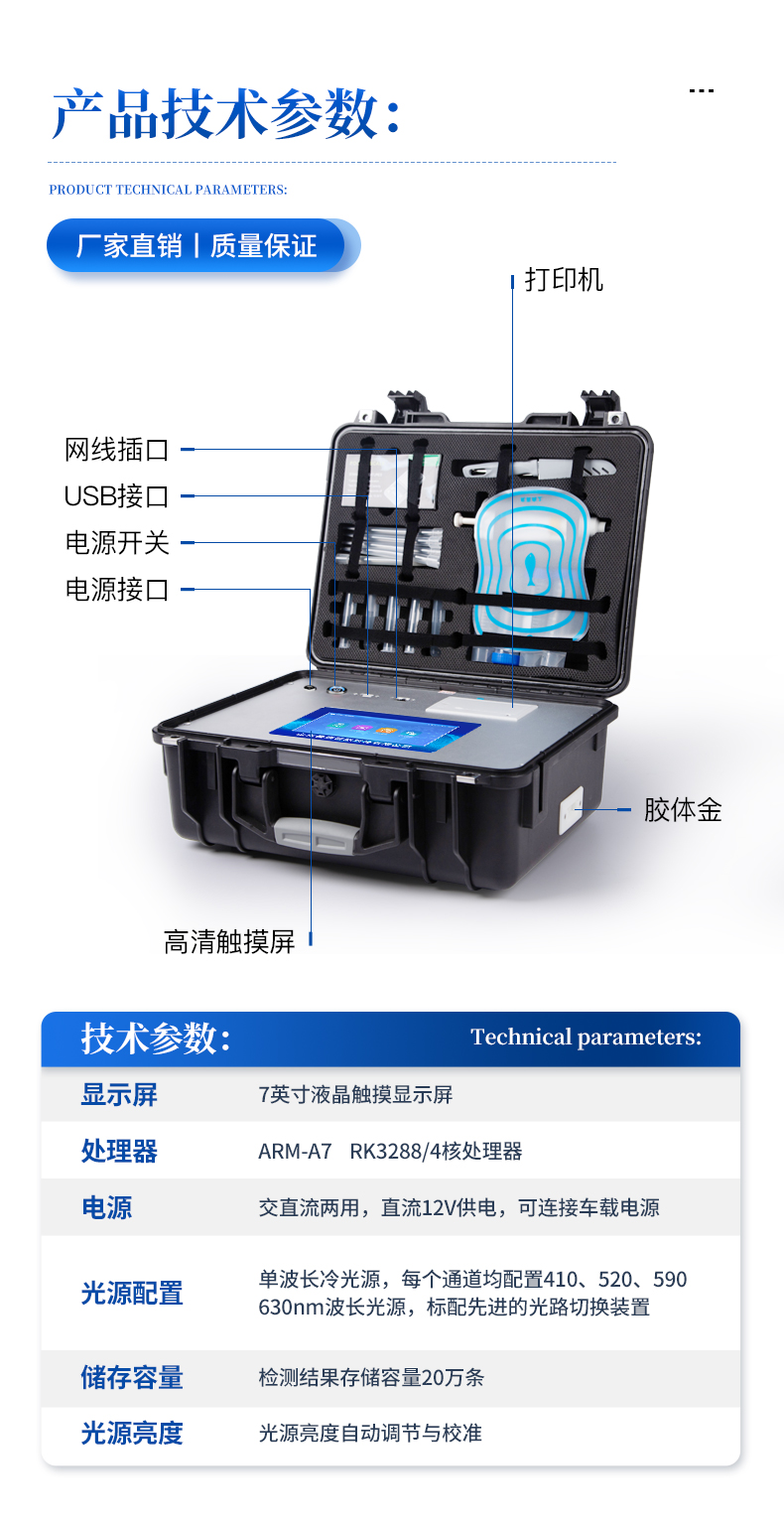 | 主控芯片采用ARM Cortex-A7,RK3288/4核處理器,主頻1.88Ghz,運(yùn)轉(zhuǎn)速度更快速,穩(wěn)定性更強(qiáng)。 | 顯示方式:7英寸液晶觸摸屏顯示,人性化中文操作界面,讀數(shù)直觀、簡單。 | 交直流兩用,直流12V供電,可連接車載電源,可配6ah大容量充電鋰電池,方便戶外流動(dòng)測試。 | 四波長冷光源,每個(gè)通道均配置410、520、590、630nm波長光源,標(biāo)配**的光路切換裝置,專利光路切換功能可實(shí)現(xiàn)*多64波長,并且所有檢測項(xiàng)目可實(shí)現(xiàn)所有通道同時(shí)檢測。 | 光源亮度自動(dòng)調(diào)節(jié)與校準(zhǔn) | 智能恒流穩(wěn)壓,光強(qiáng)自動(dòng)校準(zhǔn),長時(shí)間連續(xù)工作光源無溫漂現(xiàn)象。 | 內(nèi)置新國家限量標(biāo)準(zhǔn),與所測結(jié)果進(jìn)行現(xiàn)場比對(duì),并持續(xù)更新標(biāo)準(zhǔn)。 | 不間斷進(jìn)樣,連續(xù)檢測 | 樣本編號(hào)自動(dòng)累加。 | 數(shù)據(jù)無線上傳平臺(tái),并可從平臺(tái)導(dǎo)出為Excel表格。 | 檢測結(jié)果存儲(chǔ)容量20萬條 | 同時(shí)支持U盤拷貝,標(biāo)準(zhǔn)USB接口,免驅(qū)動(dòng)插拔。 | 檢測項(xiàng)目可擴(kuò)充,固件可升級(jí) | 儀器尺寸:43×35×20cm, 主機(jī)凈重:5.2kg |