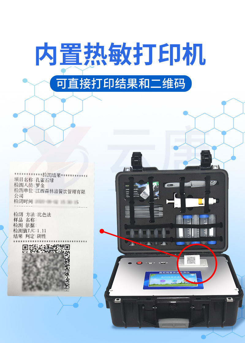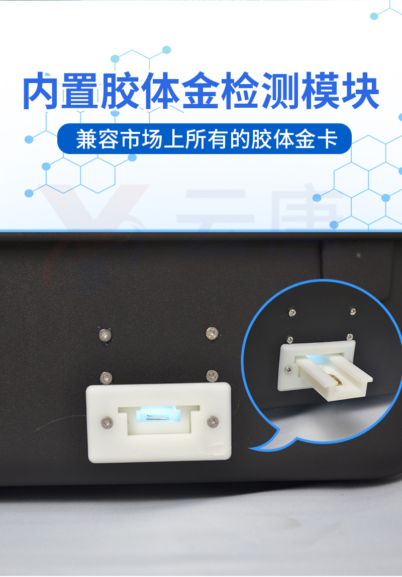 安卓智能操作系統,采用更加**和人性化操作,儀器具有網線連接、wifi聯網上傳、4G無線遠傳功能,快速上傳數據。智能化程度高,儀器具有自檢功能:具有開機自檢和調零功能,具有自動檢測重復性功能。新一代高速熱敏打印機,檢測完成可自動打印檢測報告和二維碼。儀器帶有監管平臺,數據可局域網和互聯網數據上傳,檢測結果直接傳至食品安全監管平臺。進行區域食品安全監管及大數據分析處理與數據統計,檢測區域食品安全長短期動態,達到食品安全問題預估、預警一體化便攜式快檢設備,滿足現場及流動檢測使用需求,能夠在同一軟件下實現所有檢測項目的檢測,并可通過同一窗口直觀顯示檢測結果。膠體金模塊檢測方式:軌道式自動傳輸掃描,檢測完成后自動退出檢測卡。CT線自動識別,無需手動調整。儀器具有品類多種類樣品菜單庫,可靈活選擇檢測樣品,不同的檢測通道可同時檢測不同的樣品項目。樣品處理簡單省力,整體操作快速、安全、便捷。儀器具有自身保護功能,可設置用戶名及密碼,防止非工作人員操作等。高靈敏度,高檢測精度,高重復性精度,掃描式高精度光學傳感器。內置強大的數據庫,可在儀器上直接選擇樣品名稱、檢測指標、送檢單位等信息,也可在儀器上直接編輯錄入樣品名稱、檢測指標、送檢單位等信息并保存進樣品數據庫。儀器具有重新校準、鎖定、恢復出廠設置功能。結果判定線可修改,對照值標定值可保存,斷電不丟失數據。兼容市場上所有的膠體金卡,使用耗材不受限制,極大增強用戶使用體驗。