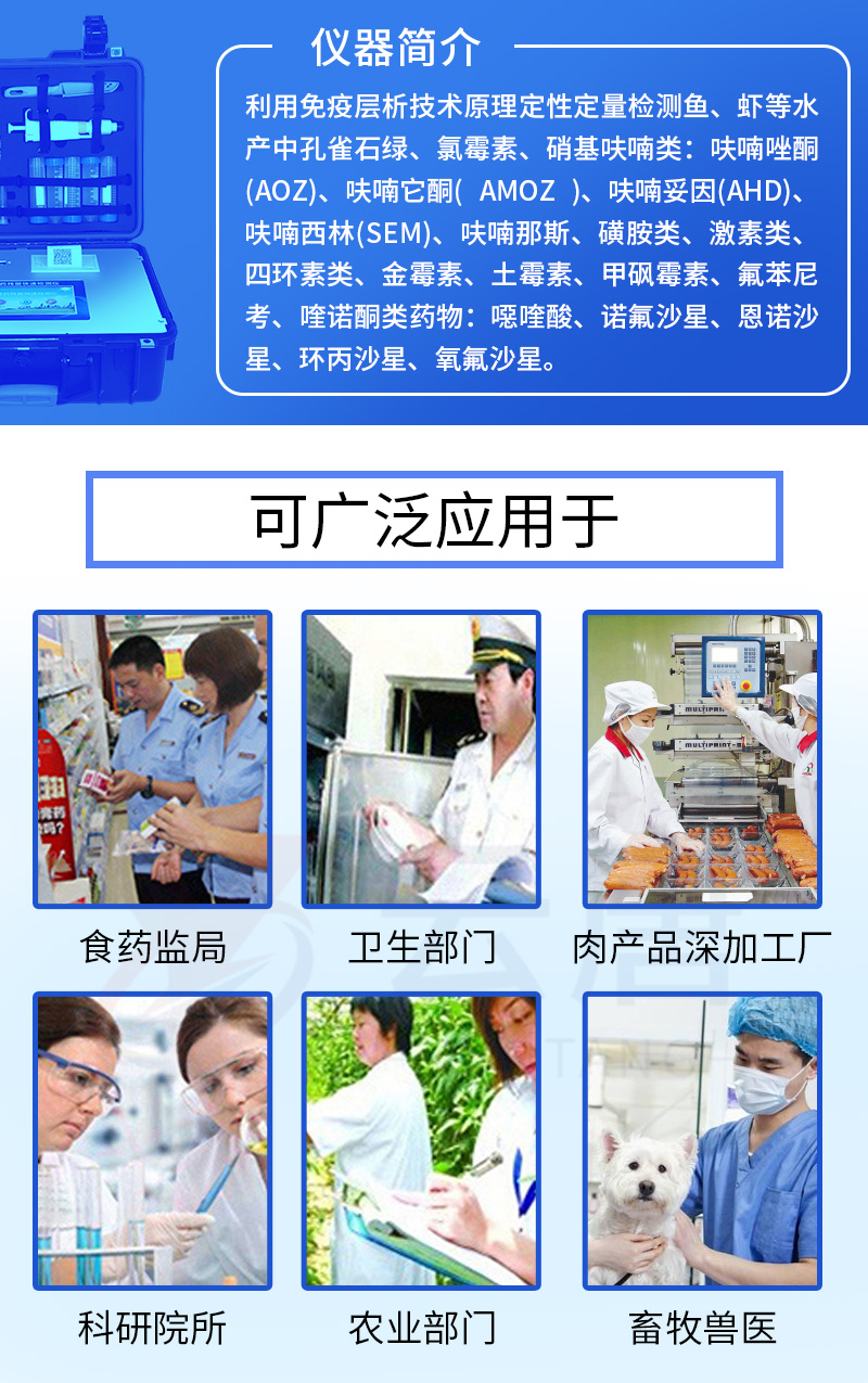 適用于魚、蝦等水產中孔雀石綠、氯霉素、硝基呋喃類:呋喃唑酮(AOZ)、呋喃它酮( AMOZ )、呋喃妥因(AHD)、呋喃西林(SEM)、呋喃那斯、磺胺類、激素類、四環素類、金霉素、土霉素、甲砜霉素、氟苯尼考、喹諾酮類藥物:噁喹酸、諾氟沙星、恩諾沙星、環丙沙星、氧氟沙星的定性定量檢測。