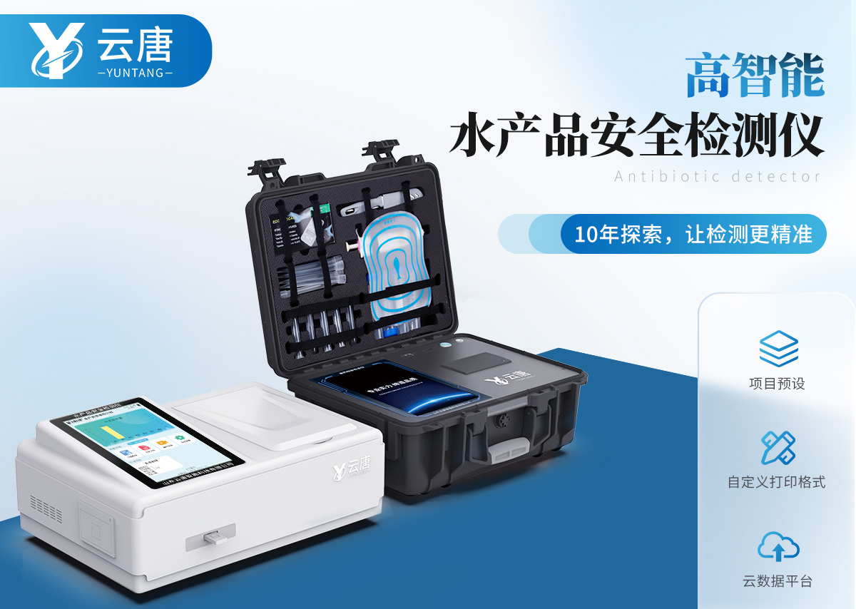 山東云唐智能科技有限公司生產(chǎn)的水產(chǎn)品安全檢測儀可適用于魚、蝦等水產(chǎn)中孔雀石綠、氯霉素、硝基呋喃類:呋喃唑酮(AOZ)、呋喃它酮( AMOZ )、呋喃妥因(AHD)、呋喃西林(SEM)、呋喃那斯、磺胺類、激素類、四環(huán)素類、金霉素、土霉素、甲砜霉素、氟苯尼考、喹諾酮類藥物:噁喹酸、諾氟沙星、恩諾沙星、環(huán)丙沙星、氧氟沙星等藥物殘留的定性檢測