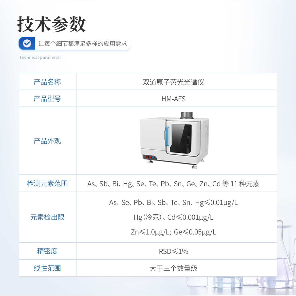 雙道原子熒光光譜儀廣泛應用于汞(Hg)、砷(As)、銻(Sb)、鉍(Bi)、硒(Se)、碲(Te)、鎘(Cd)、鍺(Ge)、鉛(Pb)、錫(Sn)、鋅(Zn)等11 種元素的痕量、超痕量分析,體積小巧,性能穩定,操作簡單。