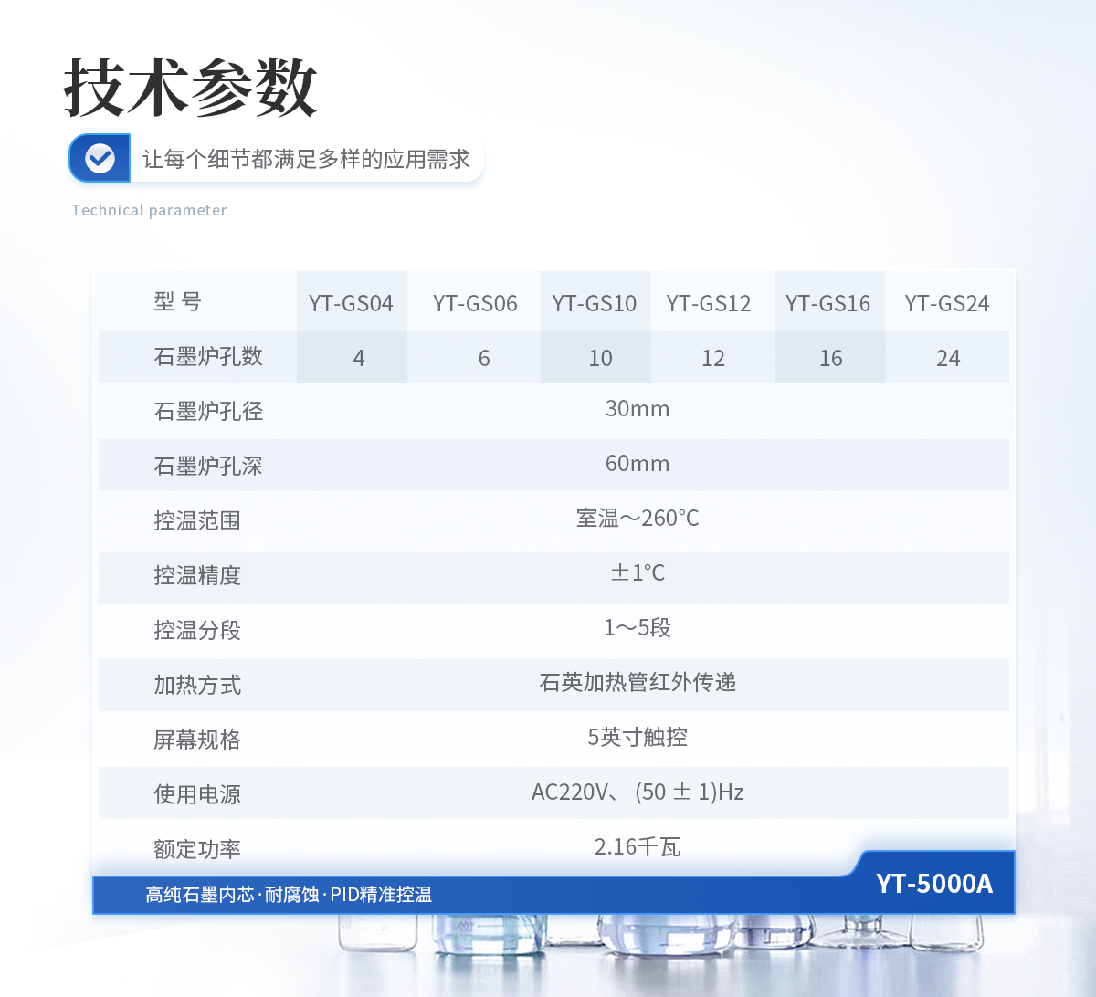 石墨爐孔:孔徑30mm,孔深60mm,孔數4×3 控溫范圍:室溫~260℃ 控溫精度:±1℃ 控溫分段:1~5段 加熱方式:石英加熱管紅外傳遞 屏幕規格:5寸觸控 主機外型尺寸:寬477mm×深460mm×高168mm 使用電源:AC220V、 (50 ± 1)Hz 額定功率:1.62千瓦