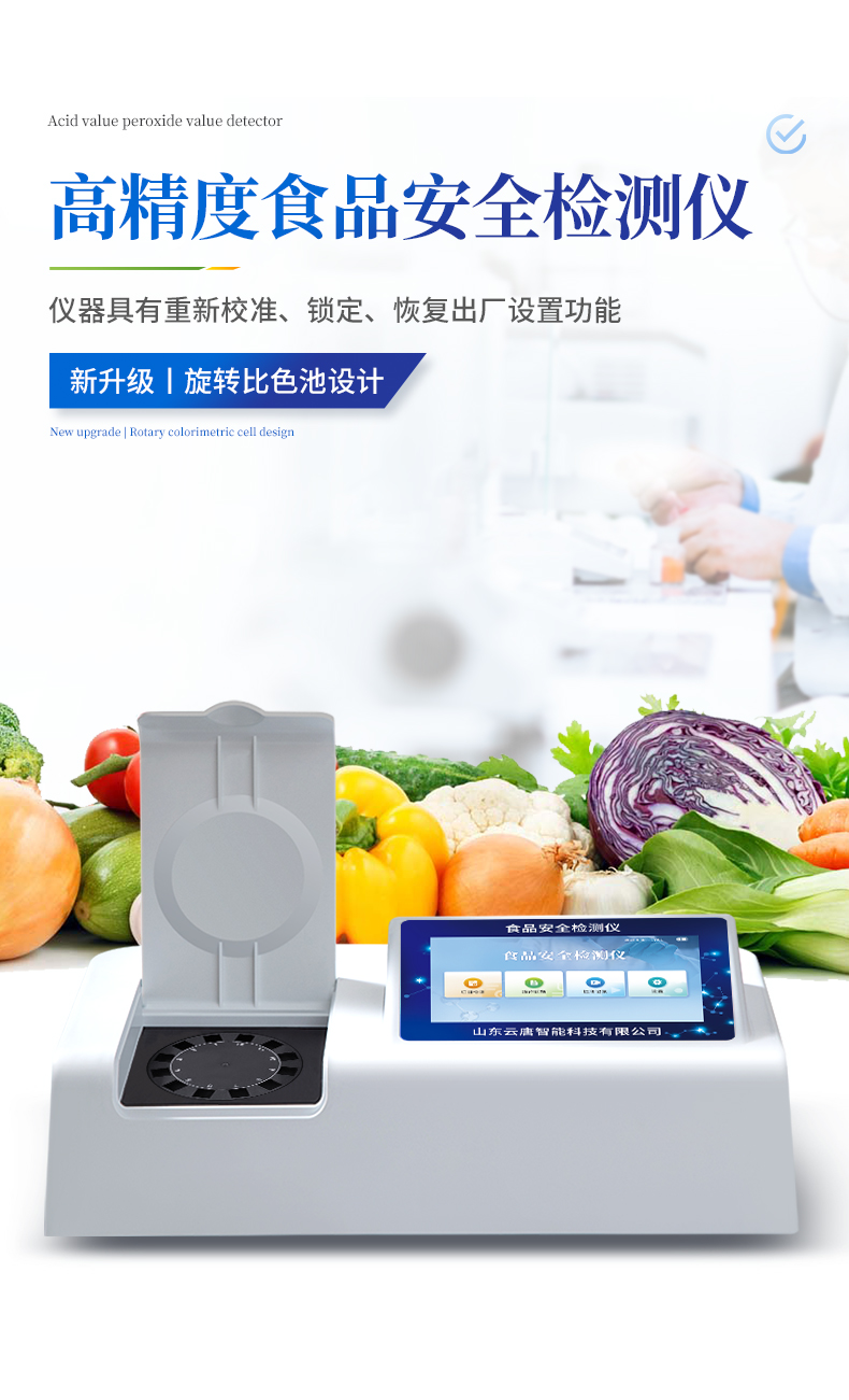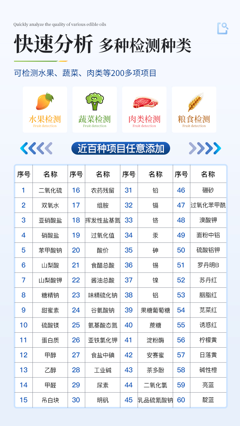 高精度食品安全檢測儀可快速檢測60多項目,包含:濫用食品添加劑、非食用化學物質、農藥殘留、重金屬含量、病害肉成分、營養強化劑、化學類殘留、食用油脂檢測、水酒飲品分析、調味品成分、食用色素等現場的定性定量檢測。