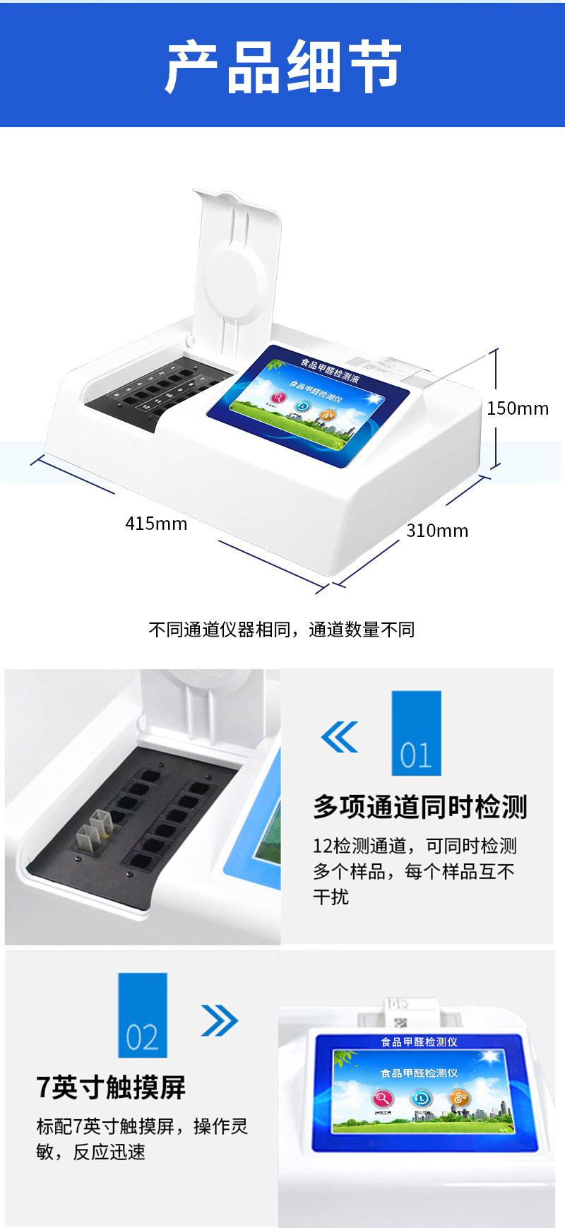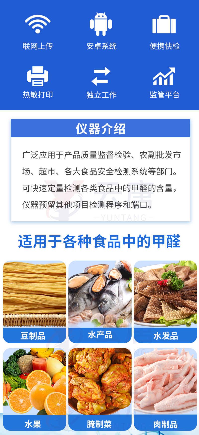 可快速定量檢測(cè)各類食品中的甲醛的含量,儀器預(yù)留其他項(xiàng)目檢測(cè)程序和端口,根據(jù)日后需求可方便的自主增加檢測(cè)項(xiàng)目。日后可升級(jí)為檢測(cè),水產(chǎn)品,肉制品,面制品的綜合類型儀器。