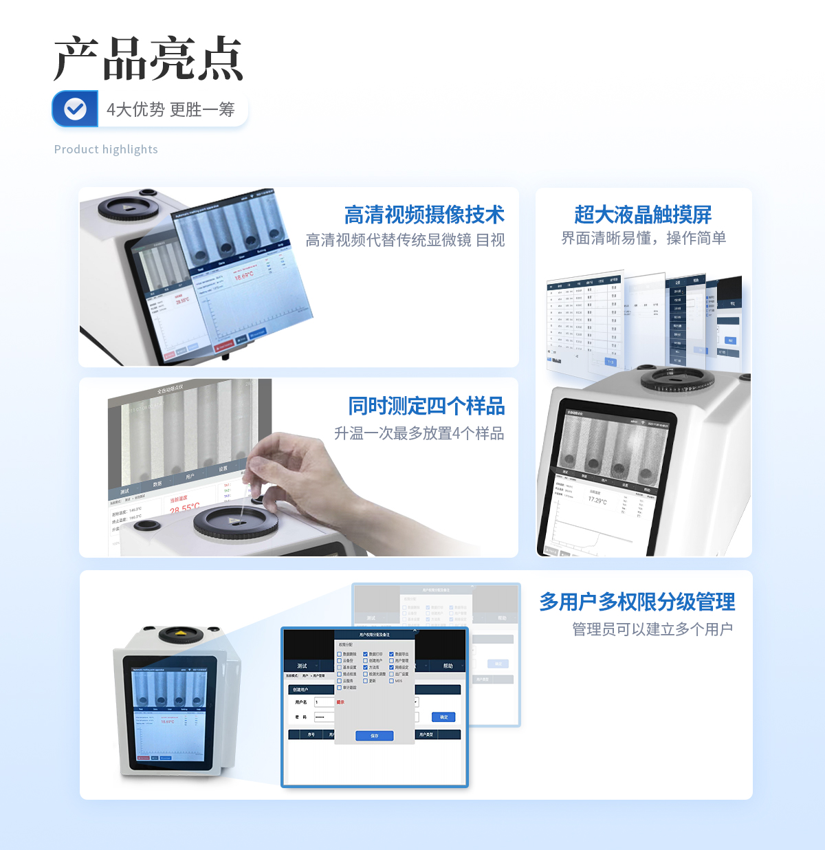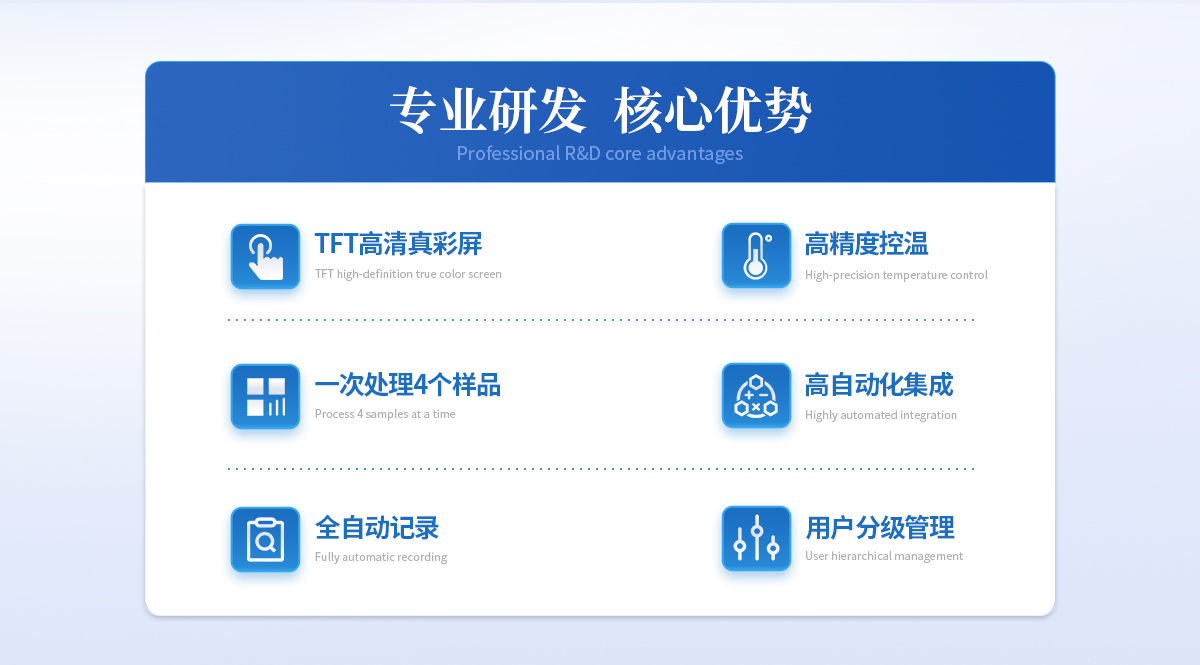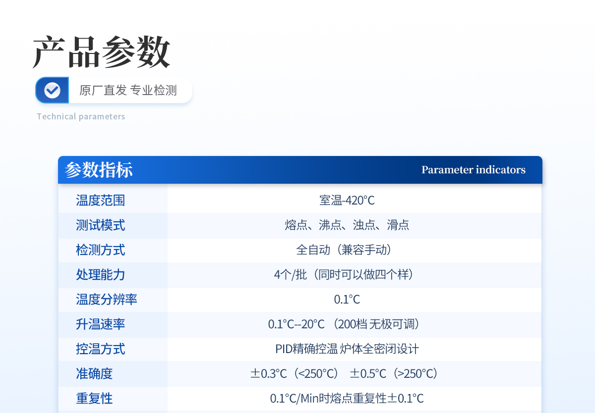 | 1、自動化集成,實(shí)現(xiàn)一鍵測定功能; | 2、一次處理4個樣品; | 3、高清視頻代替?zhèn)鹘y(tǒng)顯微鏡 目視高; | 4、半自動記錄熔程,初熔,終熔; | 5、可通過打印機(jī)直接打印數(shù)據(jù); | 6、符合21CFR Part 11、審計追蹤、藥典及電子簽名 | 7、符合GLP要求規(guī)范; | 8、符合藥典2015。 |