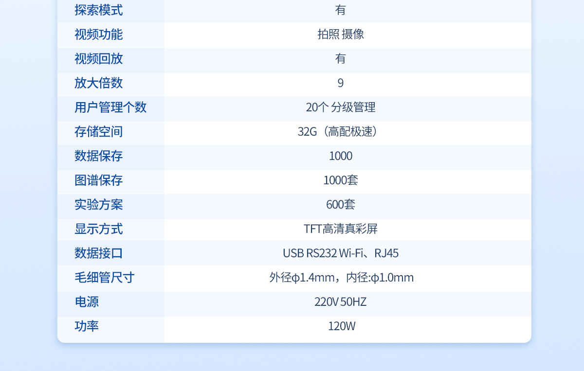 | 溫度范圍: 室溫-350℃ | 檢測方式: 半自動/手動 | 處理能力: 4個/批(同時可以做四個樣) | 判斷能力: 視頻目視 | 溫度分辨率:0.1℃ | 升溫速率: 0.1℃--20℃ (200檔 無極可調(diào)) | 控溫方式: PID**控溫 爐體全密閉設(shè)計 | 加熱方式: 傳導(dǎo)液加熱法或者電熱塊空氣加熱法(選配) | 升溫分辨率:0.1℃ | 升溫速率: 0.1℃/Min-:20℃/Min | 準(zhǔn)確度: ±0.3℃(<200℃),±0.5℃(>200℃) | 重復(fù)性: 0.1℃/Min時熔點(diǎn)重復(fù)性±0.1℃ | 校正功能: 具備 | 探索模式: 有 | 視頻回放: 有/有時間水印 | 高清攝像頭:觀察樣品熔融狀態(tài) | 放大倍數(shù): ≥10 | 用戶管理個數(shù):30個以上 分級三級管理 | 存儲空間: 32G硬盤,≥2G內(nèi)存 | 試驗方法: 有 | 數(shù)據(jù)保存: 32G | 圖譜保存: 200 | 內(nèi)存擴(kuò)展: 可以 | 實(shí)驗方法儲存量:50套 | 審計追蹤: 有 | 網(wǎng) 絡(luò): 無線WIFI | 顯示方式: 8寸高清彩屏 | 數(shù)據(jù)接口: USB,網(wǎng)絡(luò)WiFi接口,RS232 | 數(shù)據(jù)真實(shí)性:防篡改功能 | 數(shù)據(jù)導(dǎo)出: 可用U盤導(dǎo)出 | 數(shù)據(jù)輸出形式:PDF格式和EXCL數(shù)據(jù) | 數(shù)據(jù)溢出提醒:提前自動提醒 | 打印機(jī): 選配激光打印機(jī)或熱敏/針式(兼容) | 毛細(xì)管尺寸:外徑φ1.4mm,內(nèi)徑:φ1.0mm | 電源:220V 50HZ 功率:120W |