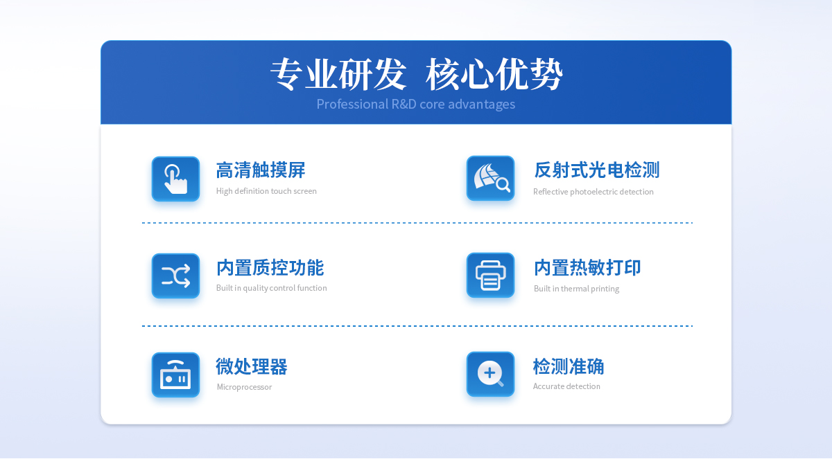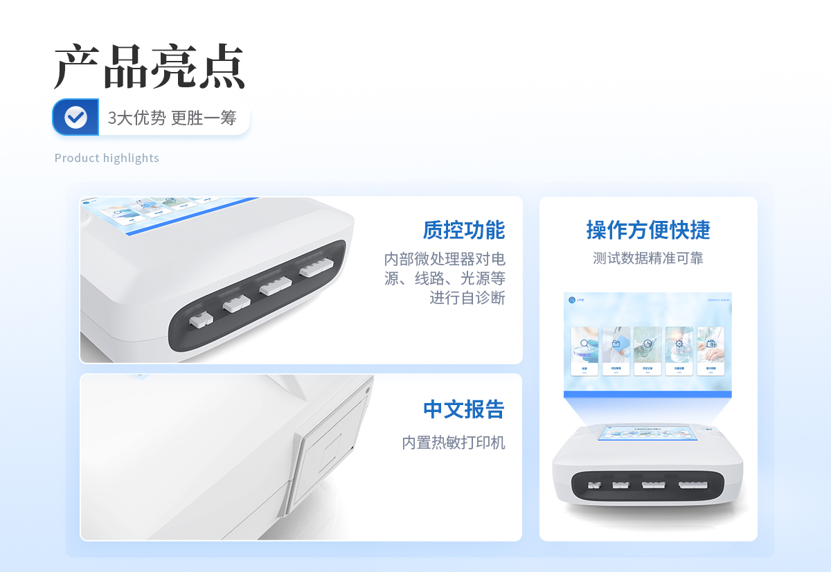 | 1、 手持式設(shè)計(jì),電池供電,緊湊輕便,兼顧移動(dòng)檢測(cè)需求 | 2、 Android4.4系統(tǒng),界面友好,操作簡(jiǎn)單流暢,無(wú)需外接設(shè)備; | 3、 8G超大容量?jī)?nèi)存,支持按日期靈活查詢、預(yù)覽、刪除結(jié)果,并生成多樣化專業(yè)報(bào)告。 | 4、 高精度光學(xué)系統(tǒng):采用特定波長(zhǎng)光源和光電傳感器,減少環(huán)境光干擾。 | 5、 二維碼掃描錄入樣本信息,避免人工錯(cuò)誤 | 6、 內(nèi)置熱敏打印機(jī),檢測(cè)完成即可現(xiàn)場(chǎng)打印標(biāo)準(zhǔn)報(bào)告,提升工作效率。 | 7、 關(guān)鍵部件實(shí)時(shí)自診斷功能,保障儀器長(zhǎng)期穩(wěn)定運(yùn)行。 | 8、 無(wú)線網(wǎng)絡(luò)及藍(lán)牙,構(gòu)建完善的數(shù)據(jù)監(jiān)控平臺(tái),實(shí)現(xiàn)數(shù)據(jù)實(shí)時(shí)上傳、遠(yuǎn)程查詢、統(tǒng)計(jì)分析和監(jiān)管協(xié)同。 | 9、 通道內(nèi)置孵育模塊,為特定試紙條反應(yīng)提供**溫度環(huán)境。 | 10、 支持多種品牌/類型的金標(biāo)試紙條 | 1、 插卡判斷:檢測(cè)卡未插入檢測(cè)通道不能檢測(cè) | 11、 內(nèi)置質(zhì)控功能,可設(shè)備送檢、設(shè)備自檢、試劑卡自檢 | 12、 檢測(cè)方式:孵育檢測(cè)、即時(shí)檢測(cè)(對(duì)檢測(cè)數(shù)據(jù)復(fù)檢核實(shí)) | 13、 檢測(cè)曲線:可以對(duì)試劑卡的檢測(cè)核驗(yàn),防止誤判。 | 14、 檢測(cè)結(jié)果:報(bào)告出檢測(cè)項(xiàng)目、被測(cè)物質(zhì)的結(jié)果、檢測(cè)單位、被檢查單位、檢驗(yàn)員、檢測(cè)時(shí)間、檢測(cè)限等信息可在觸摸屏上顯示,可通過(guò)儀器內(nèi)置打印機(jī)輸出 | 15、 項(xiàng)目管理:支持項(xiàng)目拓展 | 16、 界面設(shè)置:可修改標(biāo)題和頁(yè)尾信息,靈活展示儀器信息 |