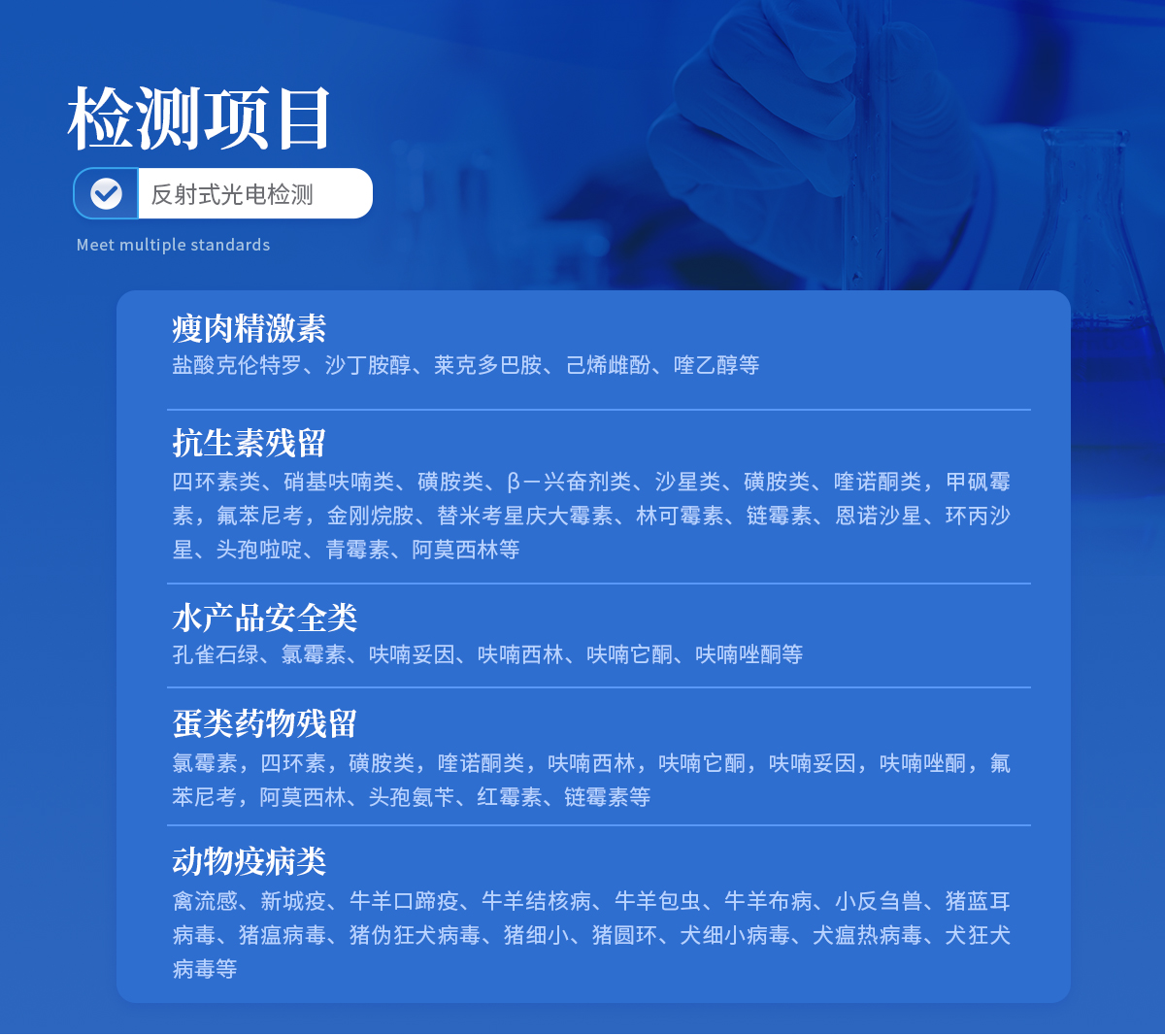 | 1、瘦肉精激素:鹽酸克倫特羅、沙丁胺醇、萊克多巴胺、己烯雌酚、喹乙醇等 | 2、 抗生素殘留:四環(huán)素類、硝基呋喃類、磺胺類、β-興奮劑類、沙星類、磺胺類、喹諾酮類,甲砜霉素,氟苯尼考,金剛烷胺、替米考星、慶大霉素、林可霉素、鏈霉素、恩諾沙星、環(huán)丙沙星、頭孢啦啶、青霉素、阿莫西林等 | 3、 水產(chǎn)品安全類:孔雀石綠、氯霉素、呋喃妥因、呋喃西林、呋喃它酮、呋喃唑酮等 | 4、蛋類藥物殘留 氯霉素,四環(huán)素,磺胺類,喹諾酮類,呋喃西林,呋喃它酮,呋喃妥因,呋喃唑酮,氟苯尼考,阿莫西林、頭孢氨芐、紅霉素、鏈霉素等 | 5、 動(dòng)物疫病類:禽流感、新城疫、牛羊口蹄疫、牛羊結(jié)核病、牛羊包蟲(chóng)、牛羊布病、小反芻獸、豬藍(lán)耳病毒、豬瘟病毒、豬偽狂犬病毒、豬細(xì)小、豬圓環(huán)、犬細(xì)小病毒、犬瘟熱病毒、犬狂犬病毒等 |