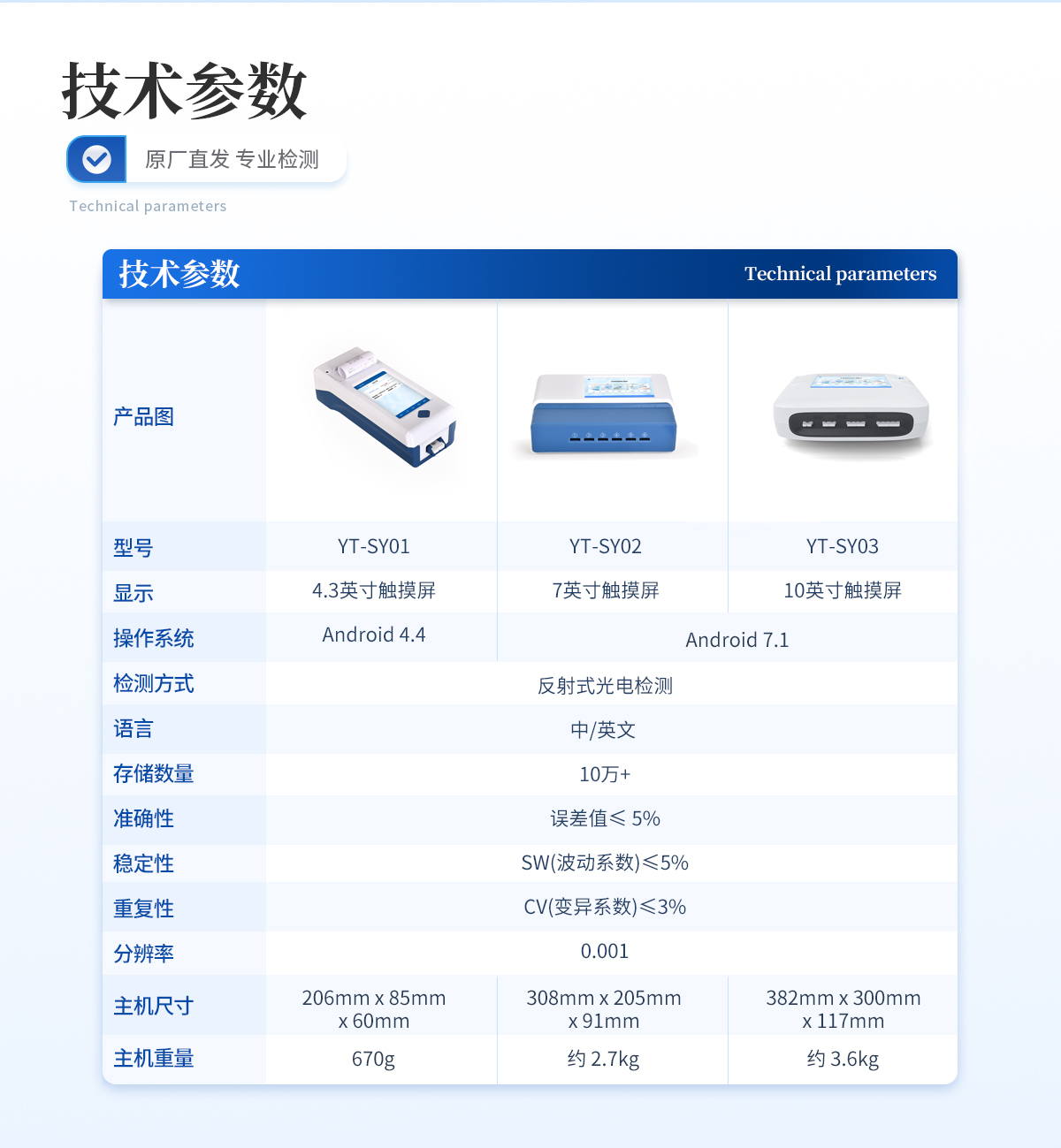 | 2、 屏幕:4.3英寸觸摸屏,分辨率:800*480,內(nèi)部存儲(chǔ):1+8GB | 3、 操作系統(tǒng):Android:4.4 | 4、 檢測(cè)方式:反射式光電檢測(cè) | 5、 適配卡殼:70mm*20mm | 6、 語(yǔ)言:中/英文: | 7、 存儲(chǔ)數(shù)量:10萬(wàn)+ | 8、 準(zhǔn)確性:誤差值≤:5% | 9、 穩(wěn)定性:SW(波動(dòng)系數(shù))≤:5% | 10、重復(fù)性:CV(變異系數(shù))≤:3% | 11、分辨率:0.001 | 12、檢測(cè)通道:?jiǎn)瓮ǖ?/td> | 13、檢測(cè)時(shí)間:<:5秒;可對(duì)樣本進(jìn)行膠體金定性/半定量檢測(cè) | 14、數(shù)據(jù)傳輸:WiFi、藍(lán)牙、Type-C | 15、數(shù)據(jù)處理:可通過(guò)通訊端口進(jìn)行數(shù)據(jù)匯總、上傳監(jiān)管平臺(tái)等 | 16、檢測(cè)通道孵育檢測(cè)一體,溫度范圍::室溫:+5℃:~:60℃ | 17、打印機(jī):熱敏打印機(jī)(熱敏打印紙:57*20mm) | 18、電源:輸入AC100V-240V/0.3A 50Hz;輸出DC5V/2A | 19、電池容量:6000mah: | 20、顯示電量 | 21、使用環(huán)境:溫度:0~50℃;濕度:0~90%: | 22、主機(jī)尺寸::206mm*85mm*60mm | 23、主機(jī)重量:670g |
