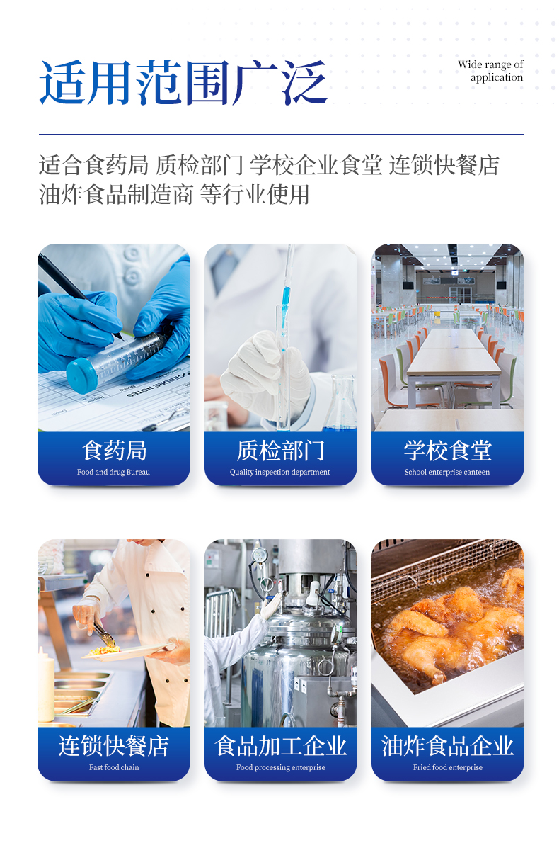 YT-SYP工業版特別適合食藥局、質檢部門、學校企業食堂、連鎖快餐店、食品加工企業、油炸食品制造商、面包房等行業使用,也可以用戶實驗室對食用油品質的初步篩選。能為您達到檢驗油品品質、節省食用油、保證產品的質量、保證食品安全的目的。
