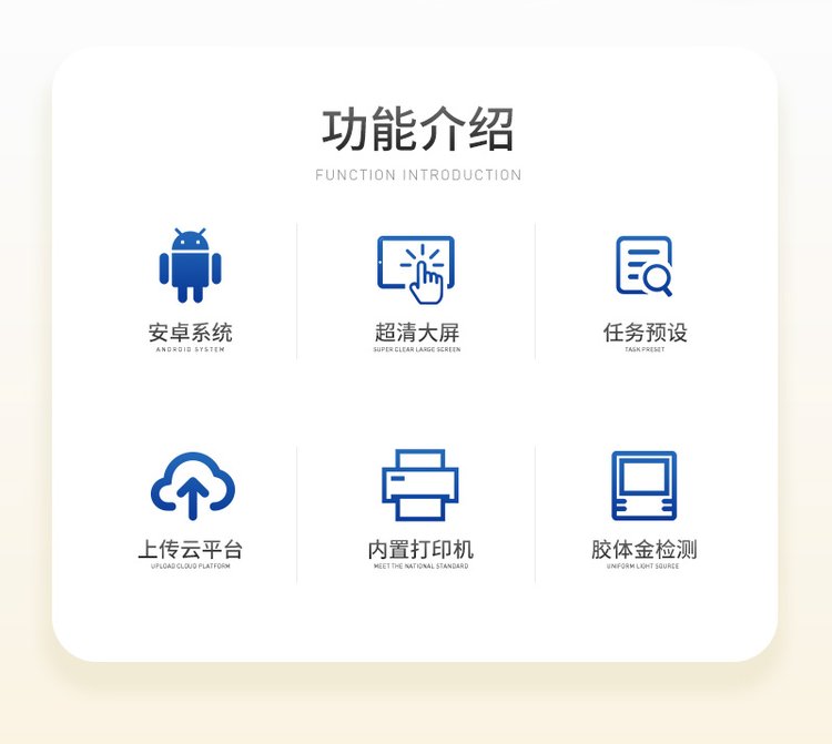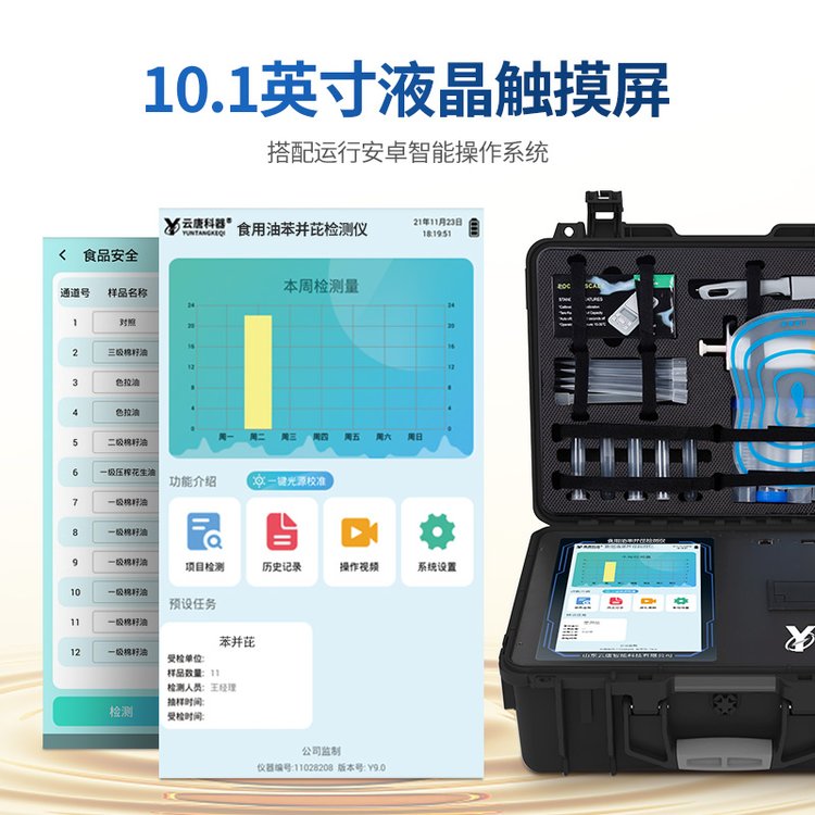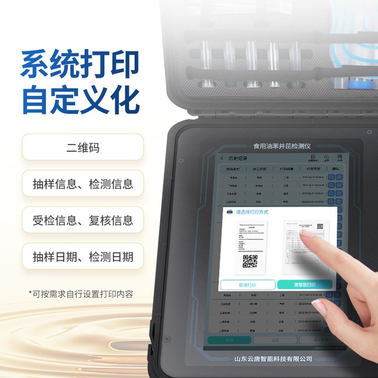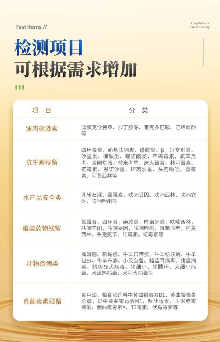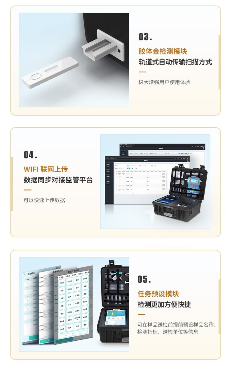 | 儀器采用10.1英寸液晶觸摸屏顯,搭配運行安卓智能操作系統,主控芯片采用ARM Cortex-A7,RK3288/4核處理器,主頻1.88Ghz,運轉速度更快速,性能更強。 | 儀器功能包括:膠體金檢測模塊、數字化管理模塊、無線通訊模塊等,可以滿足同一軟件下實現所有檢測項目的檢測,并在同一窗口展示檢測結果。 | 一體化便攜式快檢設備,采用交直流兩用供電方式,可連接車載電源,配備6ah大容量充電鋰電池,可以滿足現場及流動檢測使用的需求。儀器尺寸:43×35×20cm, 主機凈重:5.1kg | ★系統自帶數據集成模塊,設備首頁自動統計檢測數據包含:周檢測數據、月檢測數據,全部檢測總數量,均包含檢測總數,合格數,不合格數,以及相關柱形分析圖,對各項檢測數據清晰掌握,無需電腦查詢,更加快捷直觀。 | 軌道式自動傳輸掃描方式,可實時顯示金標卡實時圖像,系統自動分析并呈現出CT曲線圖,CT線自動識別,無需手動調整,完成檢測后自動退出檢測卡。 | 結果判定線可修改,對照值標定值可保存,斷電不丟失數據。 | 兼容市場上其他膠體金卡,使用耗材不受限制,極大增強用戶使用體驗。 | 儀器檢測系統擁有龐大數據庫,并且構建了完善的檢索、修訂功能。 | 食品庫涵蓋多種樣品名稱,可按需添加或刪除、編輯樣品名稱; | 產品數據庫以及歷史檢測記錄支持一鍵檢索功能。 | 系統打印自定義化,打印格式多樣化,產品合格證(國家標準要求),二維碼,抽樣信息、檢測信息,受檢信息、復核信息、抽樣日期、檢測日期等信息結果,可按需求自行設置打印內容。 | 內置限量規判程序:具有限量查詢、添加物質合規判定系統。檢測出結果后,系統自動調用系統數據庫中相關國標進行比對判定,客觀顯示判定結果是否合格,檢測對象是否允許添加該物質,若允許添加則能準確獲得食品中添加該物質的限量及添加依據的國家標準。 | 儀器具有 wifi 聯網上傳、RJ45網線連接功能,可以快速上傳數據。同步對接監管平臺,數據可局域網和互聯網數據上傳,檢測結果直接傳至食品安全監管平臺。進行區域食品安全監管及大數據分析處理與數據統計,檢測區域食品安全長短期動態,達到食品安全問題預估、預警。 | 設備支持U盤存儲,標準USB接口,免驅動安裝。檢測結果存儲容量20萬條以上,可生成Excel表格,進行一鍵拷貝,并具有登錄保護功能,可設置用戶名及密碼,規范不同人員操作權限,防止非工作人員操作,并且可以進行重新校準、鎖定、恢復出廠設置功能。儀器固件可升級,后期檢測項目可擴充。 | 儀器加入遠程升級功能,可定向分客戶分儀器更新,開機后自動更新,客戶無需任何操作,即可升級全新項目。做到了無需退換機器即可實現實時遠程升級檢測儀器。 | 可連接外部打印機,打印A4紙規格的檢測報告(可選配) |