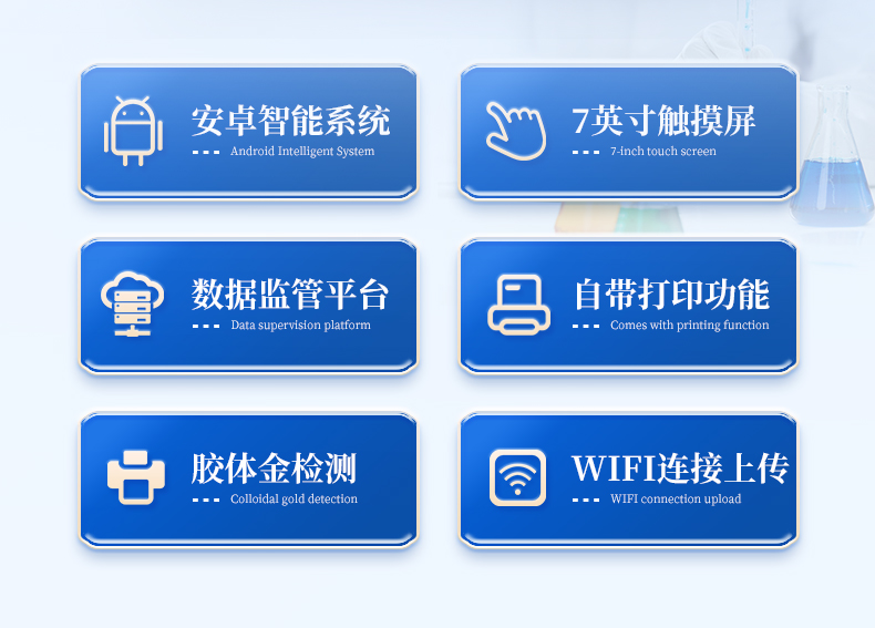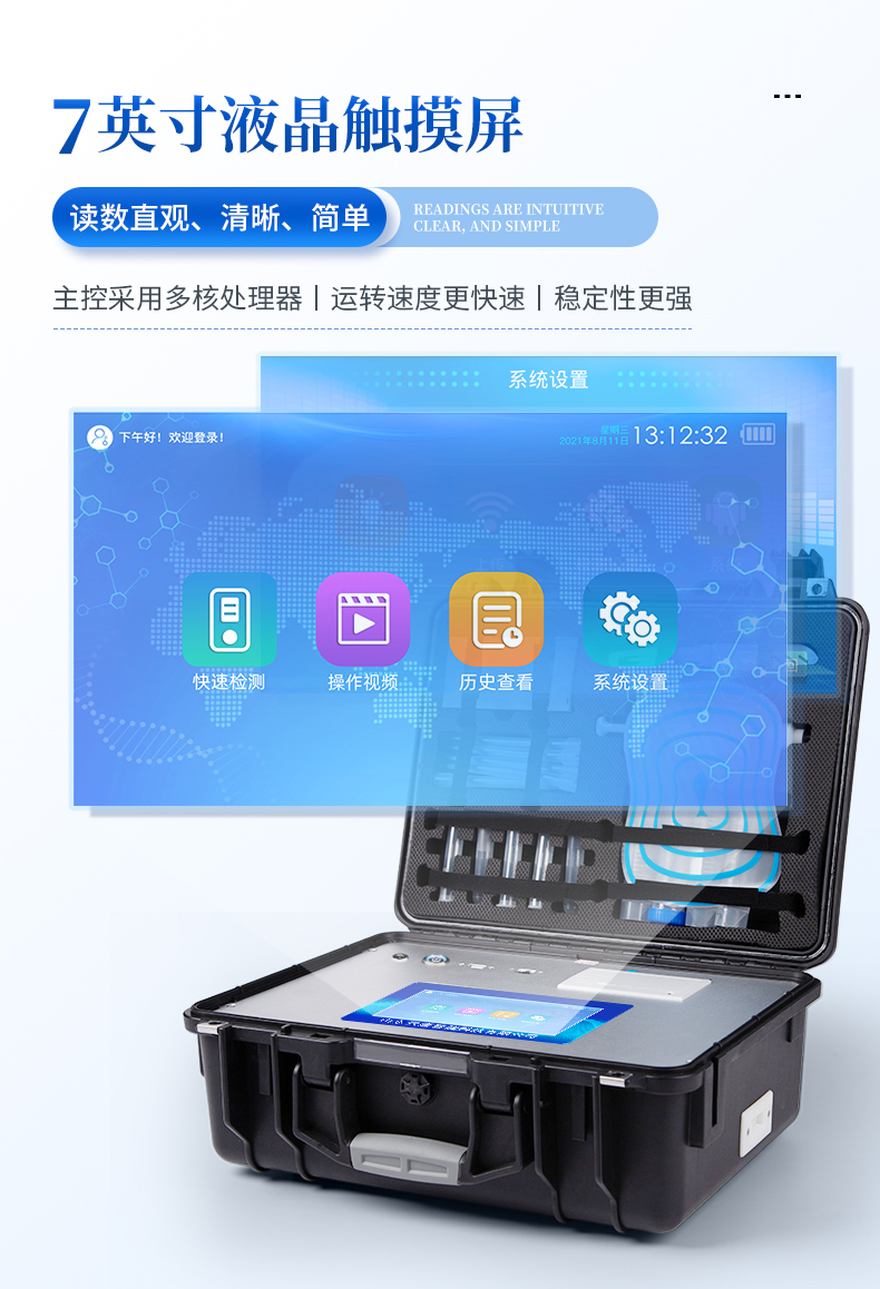 儀器采用手提式一體化系統檢測技術,將分光光度模塊、新型農殘檢測模塊、數字化管理模塊、無線通訊模塊高度集成于一體,支持檢測200種食品安全檢測項目,同時預留升級檢測方法。儀器檢測模塊標準化、智能化,檢測項目可隨意自由組合。檢測箱體內置多個標準檢測單元,檢測模塊可以調整配置。顯示屏幕:儀器采用10.1英寸豎向液晶觸摸屏顯,搭配運行安卓智能操作系統,主控芯片采用ARM Cortex-A7,RK3288/4核處理器,主頻1.88Ghz,操作方便,性能更強。檢測通道:≥12通道;采用精密旋轉比色池設計,使用同芯片同光源校準精度,解決不同光源之間的誤差值,更加準確**。(1-12通道間誤差0.1%,***:**202022821055.2)儀器光源:高精度進口四波長冷光源,每個通道均配置 410、520、590、630nm 波長光源,標配**的光路切換裝置,專利光路切換功能可實現64波長,并且所有檢測項目可實現所有通道同時檢測。設備可一鍵校準,自動保存校準數據,自動對比校驗,得到精準光源,采用Android SP存儲數據,光源數據永不丟失,方便每一次使用。通訊接口:配備無線通信模塊、4G(APN)通訊模塊、藍牙傳輸,同時具有雙USB接口以及RJ45網線接口,可以多方式實現數據保存及數據傳輸存儲方式:支持U盤存儲,標準USB接口,免驅動安裝。檢測結果存儲容量20萬條以上,可生成Excel表格進行拷貝,并具有登錄保護功能。智能化操作系統:1)操作系統:儀器可在同一檢測界面自動對應相關檢測通道,一次性選擇1-12個樣品名稱,無需退出界面,節省操作時間。并可以對每個通道屬性和樣品信息單獨進行編輯,例如送檢單位、人員,檢測人員等,打印時勾選打印顯示。2)數據集成系統:設備首頁自動匯總分析檢測數據,包含:周檢測數據、月檢測數據,全部檢測總數量,均包含檢測總數,合格數,不合格數,以及相關柱形分析圖,各項檢測數據一目了然,無需電腦查詢,更加快捷直觀。3)數據庫系統:十幾項數據庫分類管理儀器:包含項目類型、項目數據、檢測數據、歷史記錄、國標信息、曲線信息、采樣信息、檢測信息、受檢信息、復核信息、圖表信息、光源校準信息、打印樣式信息、樣品庫信息等等,數據庫之間互相協調聯動保證數據的真實完整性。同時產品數據庫以及歷史檢測記錄支持一鍵檢索功能。4)限量規判系統:具有限量查詢、添加物質合規判定系統。檢測出結果后,系統自動調用系統數據庫中相關國標進行比對判定,客觀顯示判定結果是否合格。5)項目預設系統:儀器具有任務預設模塊,一鍵提前預設,給出方便快捷的新檢測方案,每一個任務分別可以設置不同的樣品、批次、編號、來源、備注、抽樣信息、檢測信息、受檢信息、復核信息等更多信息。樣品送檢時一鍵調取保存信息,并可多次調取,大大提高檢測效率。6)數據監管系統:同步對接監管平臺,數據可局域網和互聯網數據上傳,檢測結果可選擇直接傳至食品安全監管平臺。進行區域食品安全監管及大數據分析處理與數據統計,檢測區域食品安全長短期動態,達到食品安全問題預估、預警。7)打印系統:內置全新打印機,新創自定義打印方式,可按需靈活勾選控制:產品合格證(國家農業部標準要求),二維碼,抽樣信息、檢測信息,受檢信息、復核信息、抽樣日期、檢測日期等信息的打印。供電模式:儀器交直流兩用,直流12V供電,可連接車載電源,可配6ah大容量充電鋰電池,電量可實時顯示,方便戶外流動測試。膠體金檢測模塊:采用雙通道CMOS成像處理技術及膠體金免疫層析技術,可同時讀取雙膠體金卡數據,自動采集、處理分析,將檢測結果顯示,并可根據參考限值自動判斷檢測結果,可檢測常見的獸藥殘留、生物毒素、抗生素、違禁添加物等。1)探測技術:CMOS成像探測;2)檢測通道:1個通道;3)檢測方式:消線法和比色法;4)顯示模式:陰性或陽性;5)曲線形式:軌道式掃描方式,顯示金標卡圖像,實時生成、識別CT曲線圖,無需手動調整,完成檢測后自動退出檢測卡。兼容市場上其他金標卡,使用耗材不受限制。儀器加入遠程升級功能,可定向分客戶分儀器更新,開機后自動更新,客戶無需任何操作,即可升級全新項目。做到了無需退換機器即可實現實時遠程升級檢測儀器。