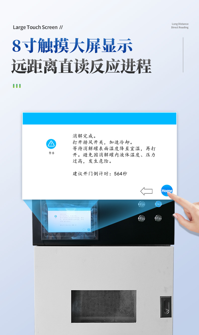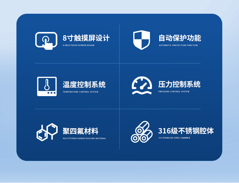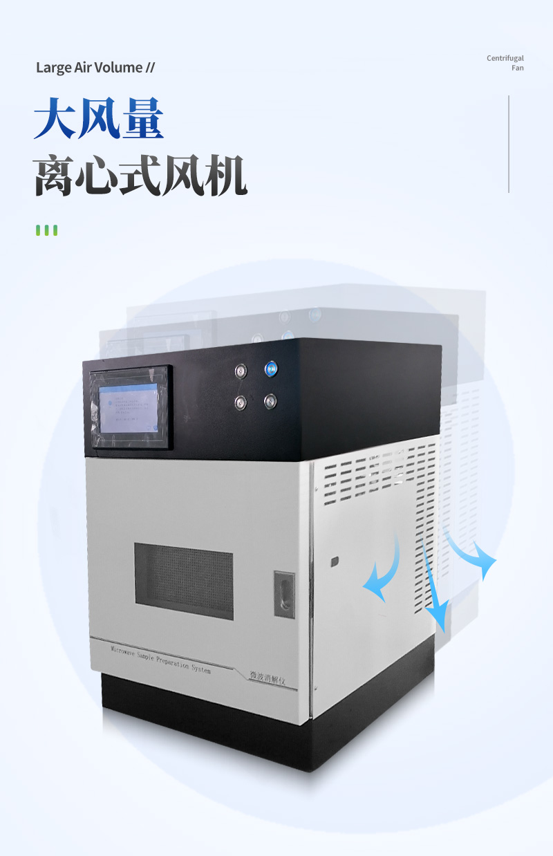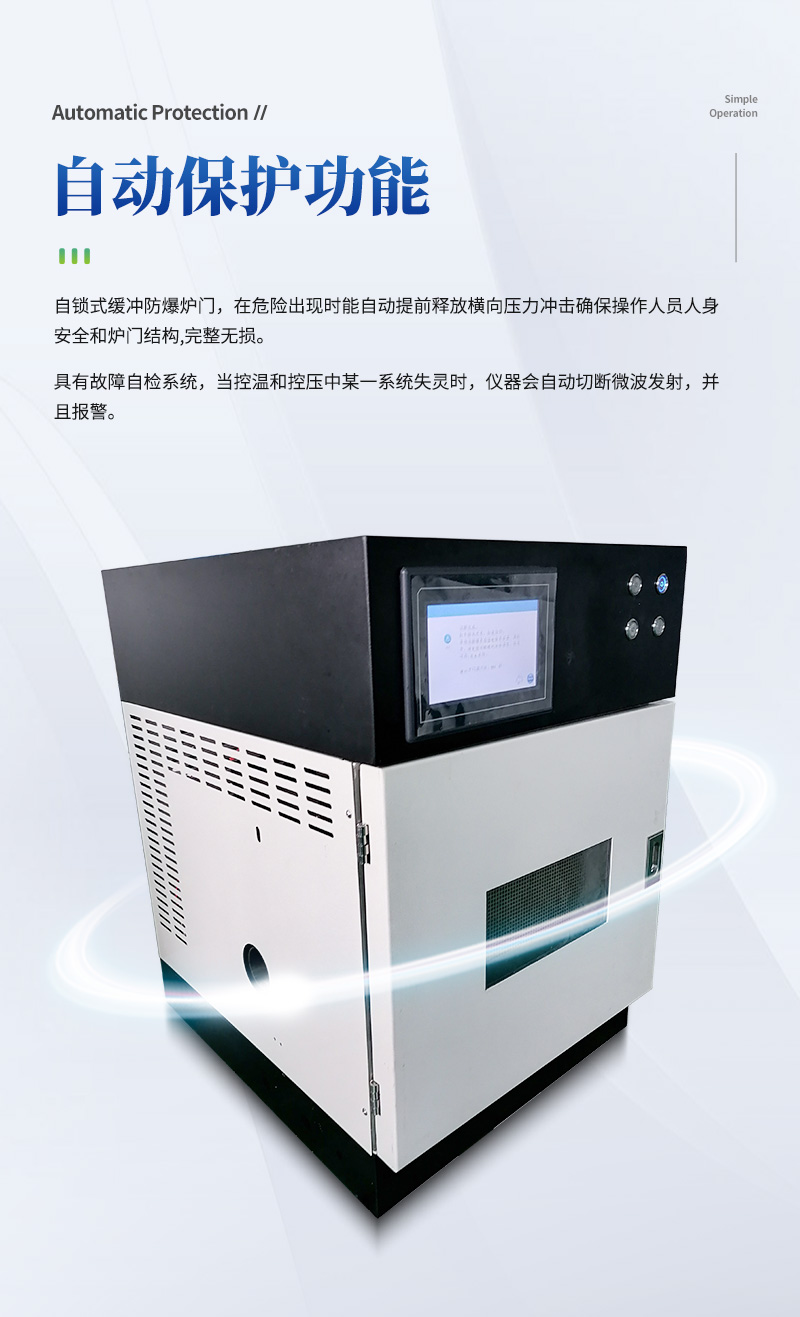 儀器采用微波非脈沖連續自動變頻控制,延長了儀器的使用壽命和電磁波的均勻性,腔體采用52L大容積316L不銹鋼腔體材料制成,自鎖式緩沖防爆爐門,當反應異常時,緩沖結構確保操作人員人身安全和爐門結構完整無損,爐門和腔體結合緊密,微波泄漏符合國家標準。儀器采用溫、壓雙控系統對消解實驗的壓力和溫度進行控制,實時顯示。360°同向連續旋轉,微波均勻,確定各個樣品微波環境相同,提高實驗結果的一致性。當罐內的壓力超過設定的保護值時,微波會自動停止加熱。安全防爆膜具有雙保險功能,當罐內的壓力超過防爆膜所能承受的壓力時,防爆膜先行破裂,氣體瀉出,防止罐體受損和對人體的傷害。