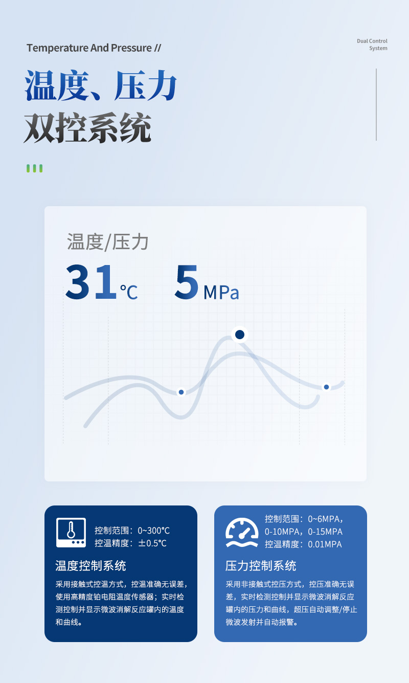 | (1)溫度控制系統:采用接觸式控溫方式,控溫準確無誤差,使用高精度鉑電阻溫度傳感器;實時檢測控制并顯示微波消解反應罐內的溫度和曲線; | (2)溫度控制范圍:0~300℃;控溫精度:±0.5℃; | (3)控溫能力:速率升溫功能。 | (4)壓力控制系統:采用非接觸式控壓方式,控壓準確無誤差,是沿襲100年技術成熟的控壓方式。實時檢測控制并顯示微波消解反應罐內的壓力和曲線; | (5)壓力控制范圍:范圍: 0~6MPa,0-10MPa.0-15MPa,任選。;控壓精度:0.01MPa; | (6)壓力保護:超壓自動調整/停止微波發射并自動報警; |