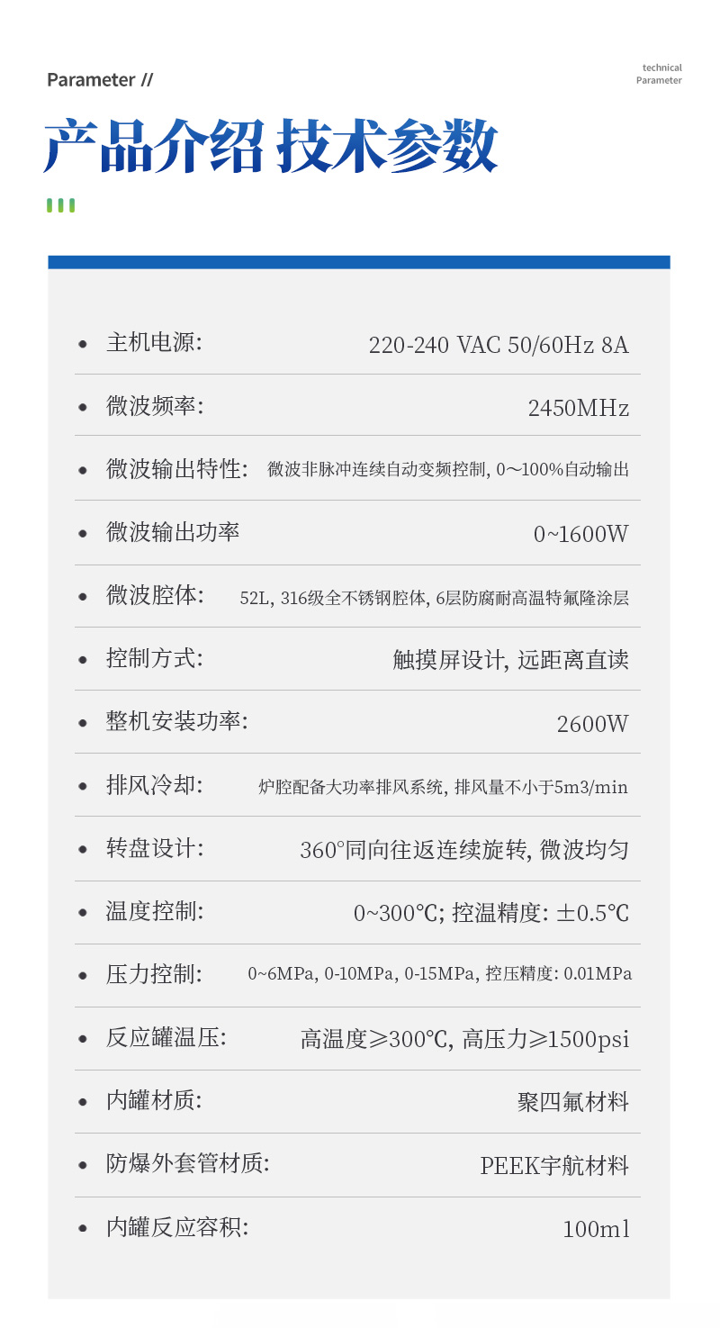 | 主機參數;1.1電 源:220-240 VAC 50/60Hz 8A ; | 微波頻率:2450MHz; | 整機安裝功率:2600W; | (1)電源要求:220 VAC 50 Hz 15A; | (2)微波源: | (3)微波輸出功率 :0~1600W; | (4)微波輸出特性:微波非脈沖連續自動變頻控制,0~100%自動輸出; | (5)微波均勻性:垂直雙向波導設計,三維輸出技術,匹配諧波功頻實現了高度的場均勻性; | (6)微波腔體:52L,316級全不銹鋼腔體,6層防腐耐高溫特氟隆涂層; | (7)自鎖式緩沖防爆爐門,在危險出現時能自動提前釋放橫向壓力沖擊,確保操作人員人身安全和爐門結構 完整無損; | (8)排風和冷卻系統:爐腔配備大功率排風系統,各種反應可在通風,安全和易于觀察的環境下長時間連續進行。爐腔通風采用耐酸蝕,大風量離心式風機,排風量不小于5m3/min;爐腔內具有風冷功能,持續為反應罐降溫,溫度和壓力實時顯示。 | (9)轉盤設計:360°同向往返連續旋轉,微波均勻,保證各個樣品微波環境相同,提高實驗結果的一致性。 | (10)控制方式:觸摸屏設計,8寸TFT-LED(800X480彩)大屏幕顯示,遠距離直讀反應進程,實時顯示密閉反應罐溫度、壓力,并可實時顯示溫壓曲線; | (11)操作語言:中文簡體 | (12)自動保護功能:具有故障自檢系統;當控溫和控壓中某一系統失靈時,儀器會自動切斷微波發射,并且報警; |