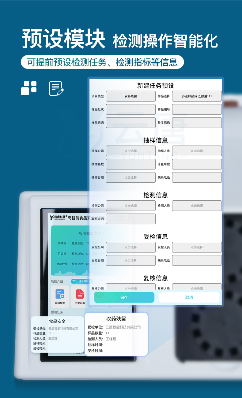 山東云唐智能科技有限公司生產(chǎn)的高智能食品安全檢測儀為集成化食品安全快速檢測分析設(shè)備,采用臺式一體化設(shè)計(jì),可快速檢測200多種食品安全項(xiàng)目,包含非食用化學(xué)物質(zhì)、濫用食品添加劑、農(nóng)藥殘留、獸藥殘留、重金屬、病害肉、營養(yǎng)強(qiáng)化劑、抗生素類殘留、激素類殘留、真菌毒素類殘留、化學(xué)類殘留等項(xiàng)目的定性定量檢測。目前廣泛應(yīng)用于市場監(jiān)管局、檢測中心、衛(wèi)生監(jiān)督部門、農(nóng)業(yè)部門、院校及各單位食堂、食品肉產(chǎn)品深加工企業(yè)、商超市場、司法部門、餐飲機(jī)構(gòu)、養(yǎng)殖場、屠宰場、檢驗(yàn)檢疫部門等單位。