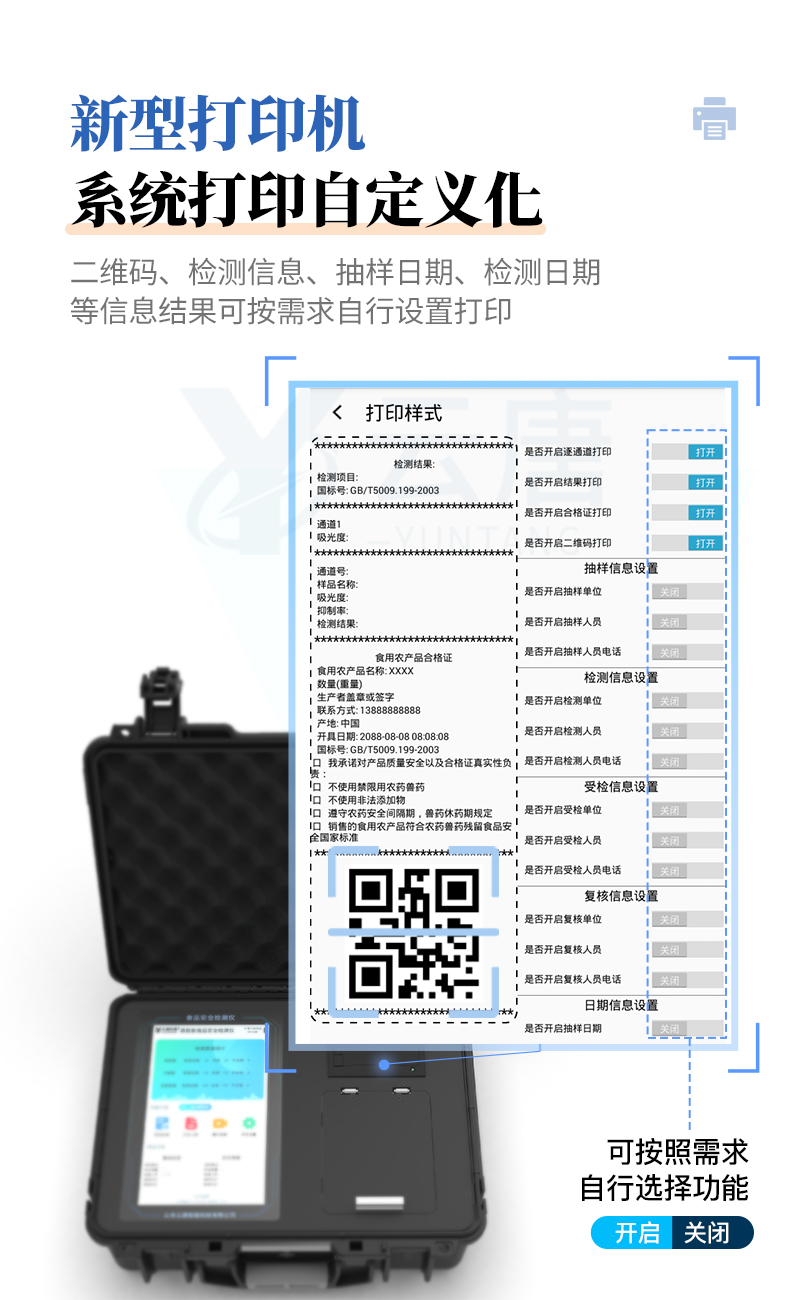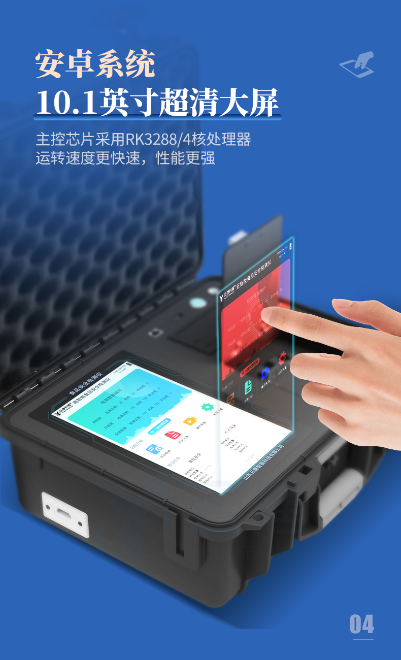 儀器采用手提式一體化系統檢測技術,將分光光度模塊、膠體金檢測模塊、新型農殘檢測模塊、數字化管理模塊、無線通訊模塊高度集成于一體,支持檢測200種食品安全檢測項目,同時預留升級檢測方法。儀器檢測模塊標準化、智能化,檢測項目可隨意自由組合。檢測箱體內置多個標準檢測單元,檢測模塊可以調整配置。 顯示屏幕:儀器采用10.1英寸豎向液晶觸摸屏顯,搭配運行安卓智能操作系統,主控芯片采用ARM Cortex-A7,RK3288/4核處理器,主頻1.88Ghz,操作方便,性能更強。檢測通道:≥12通道;采用精密旋轉比色池設計,使用同芯片同光源校準精度,解決不同光源之間的誤差值,更加準確**。(1-12通道間誤差0.1%,***:**202022821055.2)儀器光源:高精度進口四波長冷光源,每個通道均配置 410、520、590、630nm 波長光源,標配**的光路切換裝置,專利光路切換功能可實現64波長,并且所有檢測項目可實現所有通道同時檢測。設備可一鍵校準,自動保存校準數據,自動對比校驗,得到精準光源,采用Android SP存儲數據,光源數據永不丟失,方便每一次使用。通訊接口:配備無線通信模塊、4G(APN)通訊模塊、藍牙傳輸,同時具有雙USB接口以及RJ45網線接口,可以多方式實現數據保存及數據傳輸。 存儲方式:支持U盤存儲,標準USB接口,免驅動安裝。檢測結果存儲容量20萬條以上,可生成Excel表格進行拷貝,并具有登錄保護功能。智能化操作系統:: ★操作系統:儀器可在同一檢測界面自動對應相關檢測通道,一次性選擇1-12個樣品名稱,無需退出界面,節省操作時間。并可以對每個通道屬性和樣品信息單獨進行編輯,例如送檢單位、人員,檢測人員等,打印時勾選打印顯示。★數據集成系統:設備首頁自動匯總分析檢測數據,包含:周檢測數據、月檢測數據,全部檢測總數量,均包含檢測總數,合格數,不合格數,以及相關柱形分析圖,各項檢測數據一目了然,無需電腦查詢,更加快捷直觀。★數據庫系統:十幾項數據庫分類管理儀器:包含項目類型、項目數據、檢測數據、歷史記錄、國標信息、曲線信息、采樣信息、檢測信息、受檢信息、復核信息、圖表信息、光源校準信息、打印樣式信息、樣品庫信息等等,數據庫之間互相協調聯動保證數據的真實完整性。同時產品數據庫以及歷史檢測記錄支持一鍵檢索功能。★限量規判系統:具有限量查詢、添加物質合規判定系統。檢測出結果后,系統自動調用系統數據庫中相關國標進行比對判定,客觀顯示判定結果是否合格★項目預設系統:儀器具有任務預設模塊,一鍵提前預設,給出方便快捷的新檢測方案,每一個任務分別可以設置不同的樣品、批次、編號、來源、備注、抽樣信息、檢測信息、受檢信息、復核信息等更多信息。樣品送檢時一鍵調取保存信息,并可多次調取,大大提高檢測效率。★數據監管系統:同步對接監管平臺,數據可局域網和互聯網數據上傳,檢測結果可選擇直接傳至食品安全監管平臺。進行區域食品安全監管及大數據分析處理與數據統計,檢測區域食品安全長短期動態,達到食品安全問題預估、預警。★打印系統:內置全新打印機,新創自定義打印方式,可按需靈活勾選控制:產品合格證(國家農業部標準要求),二維碼,抽樣信息、檢測信息,受檢信息、復核信息、抽樣日期、檢測日期等信息的打印。供電模式:儀器交直流兩用,直流12V供電,可連接車載電源,可配6ah大容量充電鋰電池,電量可實時顯示,方便戶外流動測試。膠體金檢測模塊:采用雙通道CMOS成像處理技術及膠體金免疫層析技術,可同時讀取雙膠體金卡數據,自動采集、處理分析,將檢測結果顯示,并可根據參考限值自動判斷檢測結果,可檢測常見的獸藥殘留、生物毒素、抗生素、違禁添加物等。★探測技術:CMOS成像探測;★檢測通道:1個通道;★檢測方式:消線法和比色法;★顯示模式:陰性或陽性;★曲線形式:軌道式掃描方式,顯示金標卡圖像,實時生成、識別CT曲線圖,無需手動調整,完成檢測后自動退出檢測卡。兼容市場上其他金標卡,使用耗材不受限制。儀器加入遠程升級功能,可定向分客戶分儀器更新,開機后自動更新,客戶無需任何操作,即可升級全新項目。做到了無需退換機器即可實現實時遠程升級檢測儀器。
