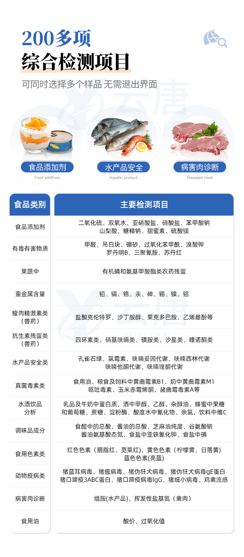食品添加劑:二氧化硫、雙氧水、亞硝酸鹽、硝酸鹽、苯甲酸鈉、山梨酸鉀、糖精鈉、甜蜜素、木耳硫酸鎂等有毒有害物質:甲醛、吊白塊、硼砂、過氧化苯甲酰、溴酸鉀、羅丹明B、三聚氰胺、蘇丹紅、工業堿、尿素、明礬等果蔬:農藥殘留(酶抑制率法)病害肉診斷:組胺、揮發性鹽基氮;重金屬含量:鉛、鎘、鉻、汞、砷、錫、鎳、鋁等;食用油脂: 過氧化值、酸價等瘦肉精激素類(獸藥):鹽酸克倫特羅、沙丁胺醇、萊克多巴胺、己烯雌酚等抗生素殘留類(獸藥):四環素類、硝基呋喃類、磺胺類、β-興奮劑類、沙星類、磺胺類、喹諾酮類,甲砜霉素,氟苯尼考,金剛烷胺、替米考星、慶大霉素、林可霉素、鏈霉素、恩諾沙星、環丙沙星、頭孢啦啶、青霉素、阿莫西林等真菌毒素類:食用油、糧食及飼料中黃曲霉毒素B1、黃曲霉毒素總量,奶中黃曲霉毒素M1、嘔吐毒素、玉米赤霉烯酮、赭曲霉毒素A、T2毒素、伏馬毒素等;水酒飲品分析:酒中甲醇、乙醇、乳品及牛奶中蛋白質,調味品成分:食醋的總酸、醬油的總酸、芝麻油純度、谷氨酸鈉、醬油氨基酸態氮、食鹽中亞鐵氰化鉀、食鹽中碘等食用色素類:紅色色素(胭脂紅、莧菜紅、赤蘚紅、誘惑紅)、黃色色素(檸檬黃、日落黃)、藍色色素(亮藍)等動物疫病類:禽流感、新城疫、牛羊口蹄疫、牛羊結核病、牛羊包蟲、牛羊布病、小反芻獸、豬藍耳病毒、豬瘟病毒、豬偽狂犬病毒、豬細小、豬圓環、犬細小病毒、犬瘟熱病毒、犬狂犬病毒等;蜂蜜成分:果糖和葡萄糖、蔗糖、淀粉酶、酸度等水產品安全類:孔雀石綠、氯霉素、呋喃妥因、呋喃西林、呋喃它酮、呋喃唑酮等蛋類藥物殘留:氯霉素,四環素,磺胺類,喹諾酮類,呋喃西林,呋喃它酮,呋喃妥因,呋喃唑酮,氟苯尼考,阿莫西林、頭孢氨芐、紅霉素、鏈霉素等