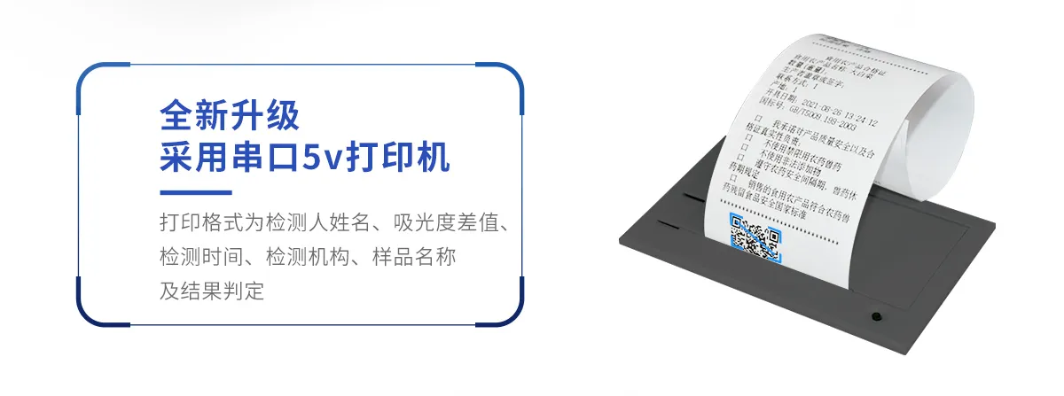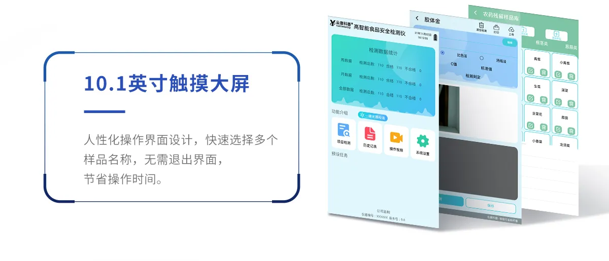 | 儀器采用手提式一體化系統檢測技術,將分光光度模塊、膠體金檢測模塊、新型農殘檢測模塊、數字化管理模塊、無線通訊模塊高度集成于一體,支持檢測200種食品安全檢測項目,同時預留升級檢測方法。 | 儀器檢測模塊標準化、智能化,檢測項目可隨意自由組合。檢測箱體內置多個標準檢測單元,檢測模塊可以調整配置。 | 顯示屏幕:儀器采用10.1英寸豎向液晶觸摸屏顯,搭配運行安卓智能操作系統,主控芯片采用ARM Cortex-A7,RK3288/4核處理器,主頻1.88Ghz,操作方便,性能更強。 | 檢測通道:≥12通道;采用精密旋轉比色池設計,使用同芯片同光源校準精度,解決不同光源之間的誤差值,更加準確**。(1-12通道間誤差0.1%,***:**202022821055.2) | 儀器光源:高精度進口四波長冷光源,每個通道均配置 410、520、590、630nm 波長光源,標配**的光路切換裝置,專利光路切換功能可實現64波長,并且所有檢測項目可實現所有通道同時檢測。 | 設備可一鍵校準,自動保存校準數據,自動對比校驗,得到精準光源,采用Android SP存儲數據,光源數據永不丟失,方便每一次使用。 | 通訊接口:配備無線通信模塊、4G(APN)通訊模塊、藍牙傳輸,同時具有雙USB接口以及RJ45網線接口,可以多方式實現數據保存及數據傳輸。 | 存儲方式:支持U盤存儲,標準USB接口,免驅動安裝。檢測結果存儲容量20萬條以上,可生成Excel表格進行拷貝,并具有登錄保護功能。 | 智能化操作系統:: ★操作系統:儀器可在同一檢測界面自動對應相關檢測通道,一次性選擇1-12個樣品名稱,無需退出界面,節省操作時間。并可以對每個通道屬性和樣品信息單獨進行編輯,例如送檢單位、人員,檢測人員等,打印時勾選打印顯示。 | ★數據集成系統:設備首頁自動匯總分析檢測數據,包含:周檢測數據、月檢測數據,全部檢測總數量,均包含檢測總數,合格數,不合格數,以及相關柱形分析圖,各項檢測數據一目了然,無需電腦查詢,更加快捷直觀。 | ★數據庫系統:十幾項數據庫分類管理儀器:包含項目類型、項目數據、檢測數據、歷史記錄、國標信息、曲線信息、采樣信息、檢測信息、受檢信息、復核信息、圖表信息、光源校準信息、打印樣式信息、樣品庫信息等等,數據庫之間互相協調聯動保證數據的真實完整性。同時產品數據庫以及歷史檢測記錄支持一鍵檢索功能。 | ★限量規判系統:具有限量查詢、添加物質合規判定系統。檢測出結果后,系統自動調用系統數據庫中相關國標進行比對判定,客觀顯示判定結果是否合格 | ★項目預設系統:儀器具有任務預設模塊,一鍵提前預設,給出方便快捷的新檢測方案,每一個任務分別可以設置不同的樣品、批次、編號、來源、備注、抽樣信息、檢測信息、受檢信息、復核信息等更多信息。樣品送檢時一鍵調取保存信息,并可多次調取,大大提高檢測效率。 | ★數據監管系統:同步對接監管平臺,數據可局域網和互聯網數據上傳,檢測結果可選擇直接傳至食品安全監管平臺。進行區域食品安全監管及大數據分析處理與數據統計,檢測區域食品安全長短期動態,達到食品安全問題預估、預警。 | ★打印系統:內置全新打印機,新創自定義打印方式,可按需靈活勾選控制:產品合格證(國家農業部標準要求),二維碼,抽樣信息、檢測信息,受檢信息、復核信息、抽樣日期、檢測日期等信息的打印。 | 供電模式:儀器交直流兩用,直流12V供電,可連接車載電源,可配6ah大容量充電鋰電池,電量可實時顯示,方便戶外流動測試。 | 膠體金檢測模塊:采用雙通道CMOS成像處理技術及膠體金免疫層析技術,可同時讀取雙膠體金卡數據,自動采集、處理分析,將檢測結果顯示,并可根據參考限值自動判斷檢測結果,可檢測常見的獸藥殘留、生物毒素、抗生素、違禁添加物等。 | ★探測技術:CMOS成像探測; | ★檢測通道:1個通道; | ★檢測方式:消線法和比色法; | ★顯示模式:陰性或陽性; | ★曲線形式:軌道式掃描方式,顯示金標卡圖像,實時生成、識別CT曲線圖,無需手動調整,完成檢測后自動退出檢測卡。兼容市場上其他金標卡,使用耗材不受限制。 | 儀器加入遠程升級功能,可定向分客戶分儀器更新,開機后自動更新,客戶無需任何操作,即可升級全新項目。做到了無需退換機器即可實現實時遠程升級檢測儀器。 |